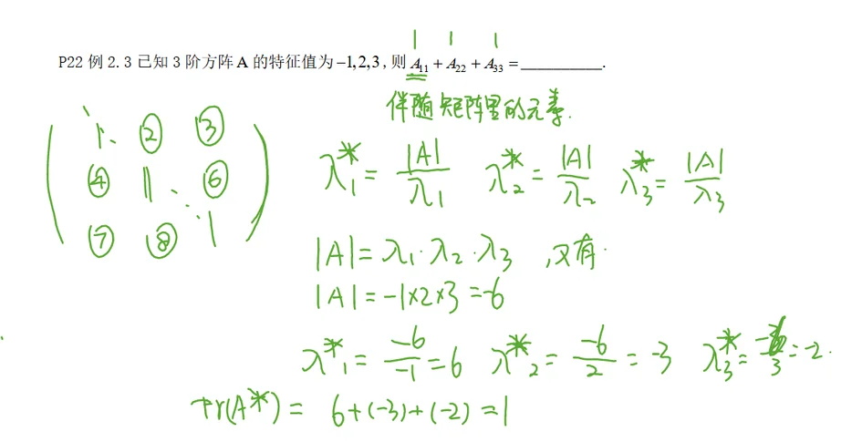 例2.3 题目 Q:P22 已知 3 阶方阵 的特征值为 ,则 分析 A:这不是那种同一行或者同一列的 注意这种东西是代数余子式,也就是伴随矩阵里面的每个元素,这里的这个问题就是在问伴随矩阵的迹是多少,也就是把特征值给定了 解
