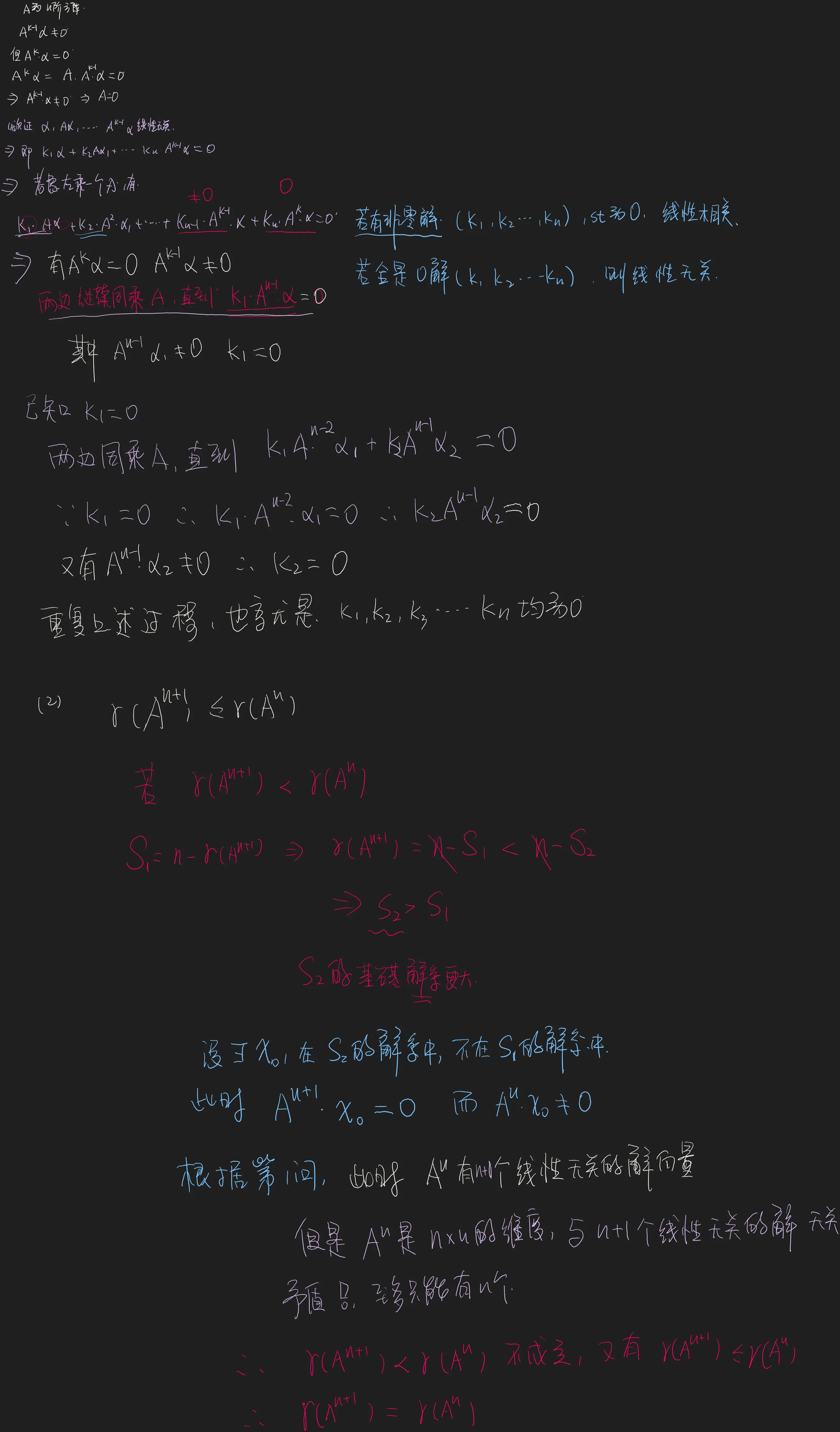 例5.6 题目 Q:P86 设 为 阶方阵,证明: (1) 若 ,但是 ,则 ( 为正整数) 线性无关; (2) 分析 A:一般是用线性无关的定义,拿到那个式子,两边做同乘或者其他等价变形,来处理成我们需要的式子 对于高次矩阵的幂,比如这种条件,可以写成,又因为秩越乘越小,可以得到关于矩阵的秩的不等式 解 (1) 假设线性相关,则存在不全为0的数,使得 两边同时左乘,得 因为,所以 又因为,所以。 同理,可以证明,这与假设矛盾,所以线性无关。 (2) 因为 设的列向量组的极大线性无关组为,其中,则 因为,所以 可以由线性表出,所以 综上,。