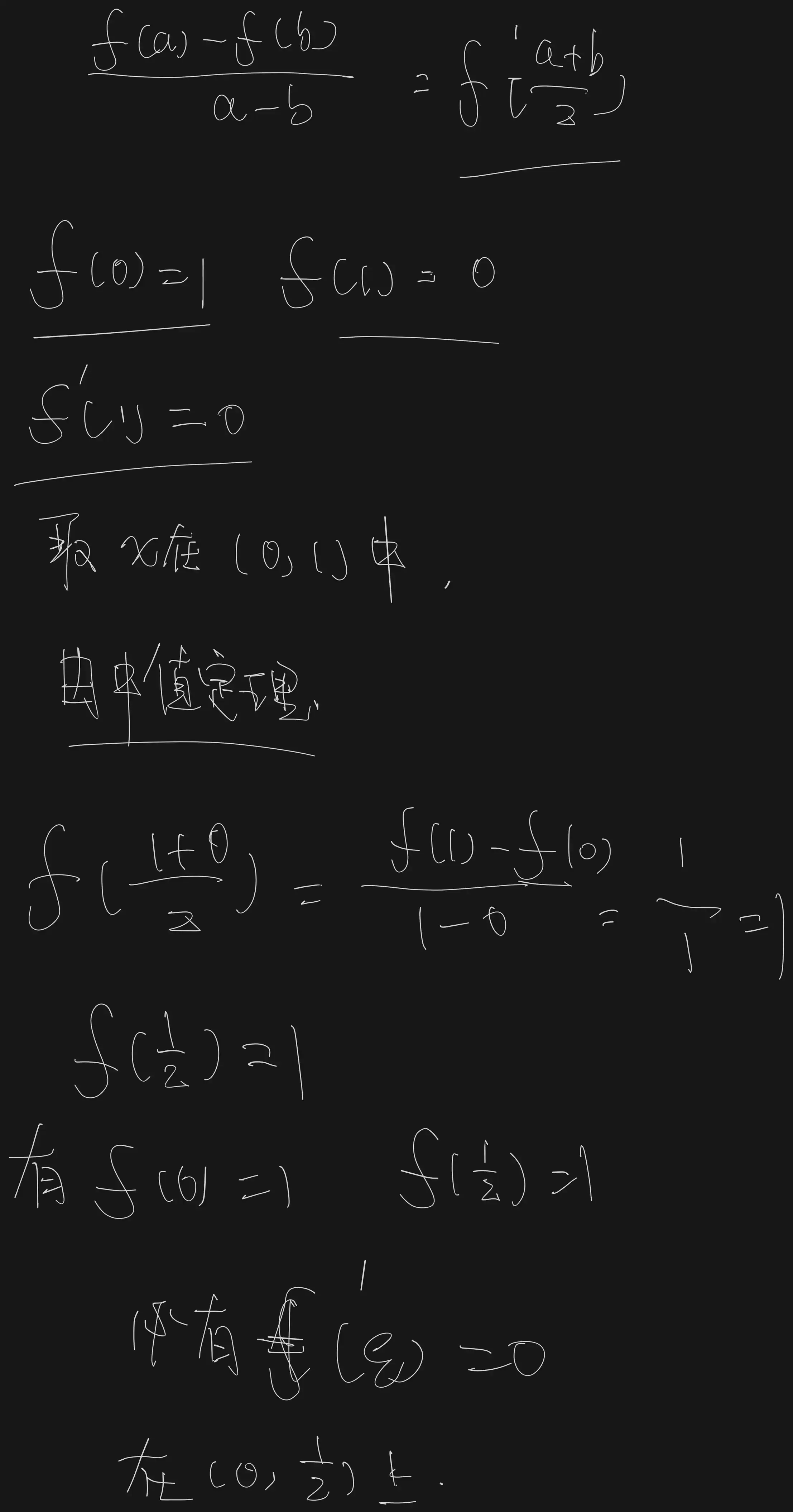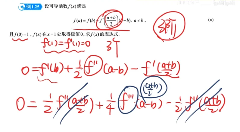 例1.25 题目 Q:设可导函数 满足 ,且 在 处取得极值 0,求 的表达式. 分析 A:区分同时出现a或者b,是用拉格朗日中值定理还是应该变换主元求偏导 拉格朗日中值定理要是想要取到中间,最多只能是二次函数,这是充要的 解 (*) 式两边对 求导, 式两边对 求导, 由于 ,故 . 又因该等式对任意不等的 均成立,故有 ,即 由于 ,因此有 . 又 ,且 ,因此有 . 所以 ,故 .