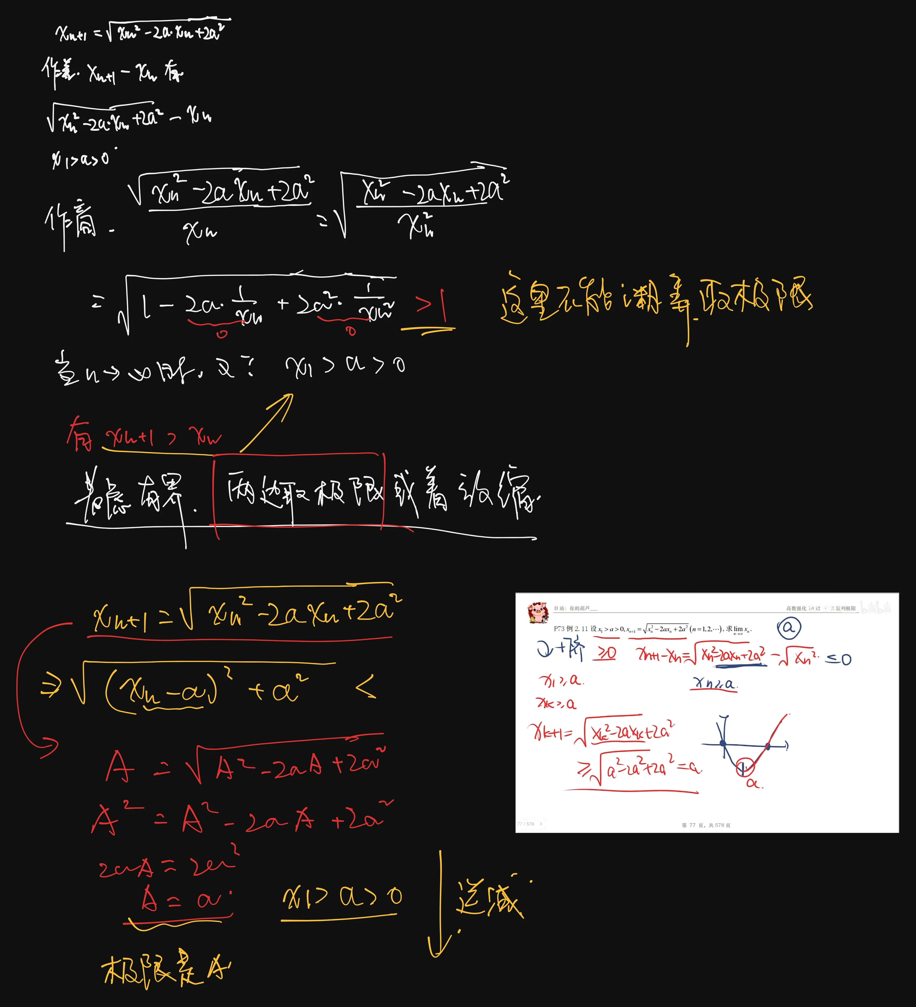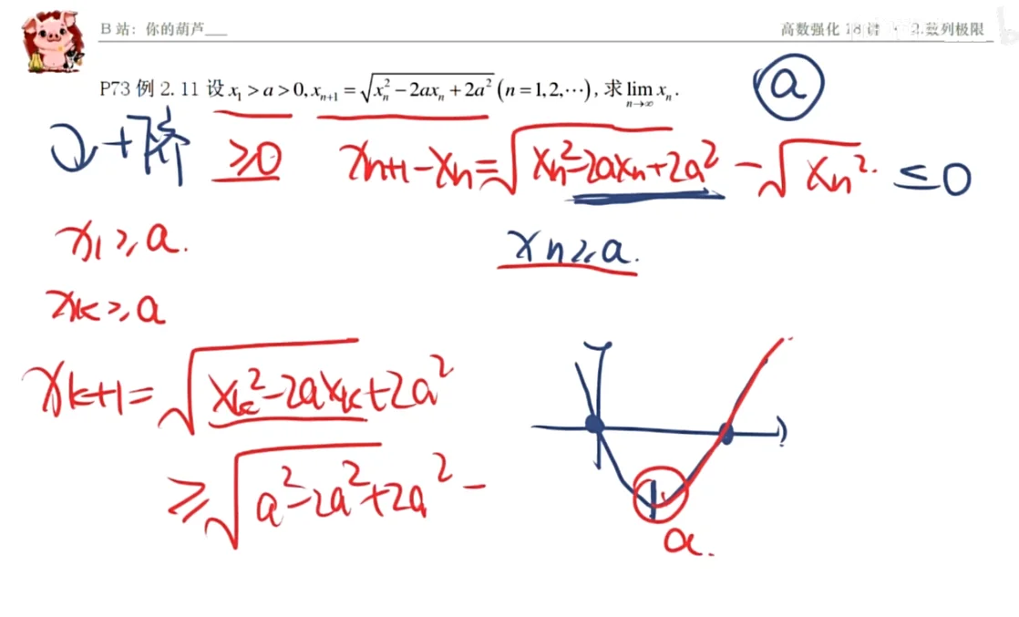 例2.11 题目 Q:P73 设 ,求 . 分析 A:求导后的导函数不好确定上界和下界,考虑单调有界来处理 02:17 解 由 ,又 ,故数列 单调减少且有下界,因此数列 收敛. 设 ,则有 ,解得 ,故 .