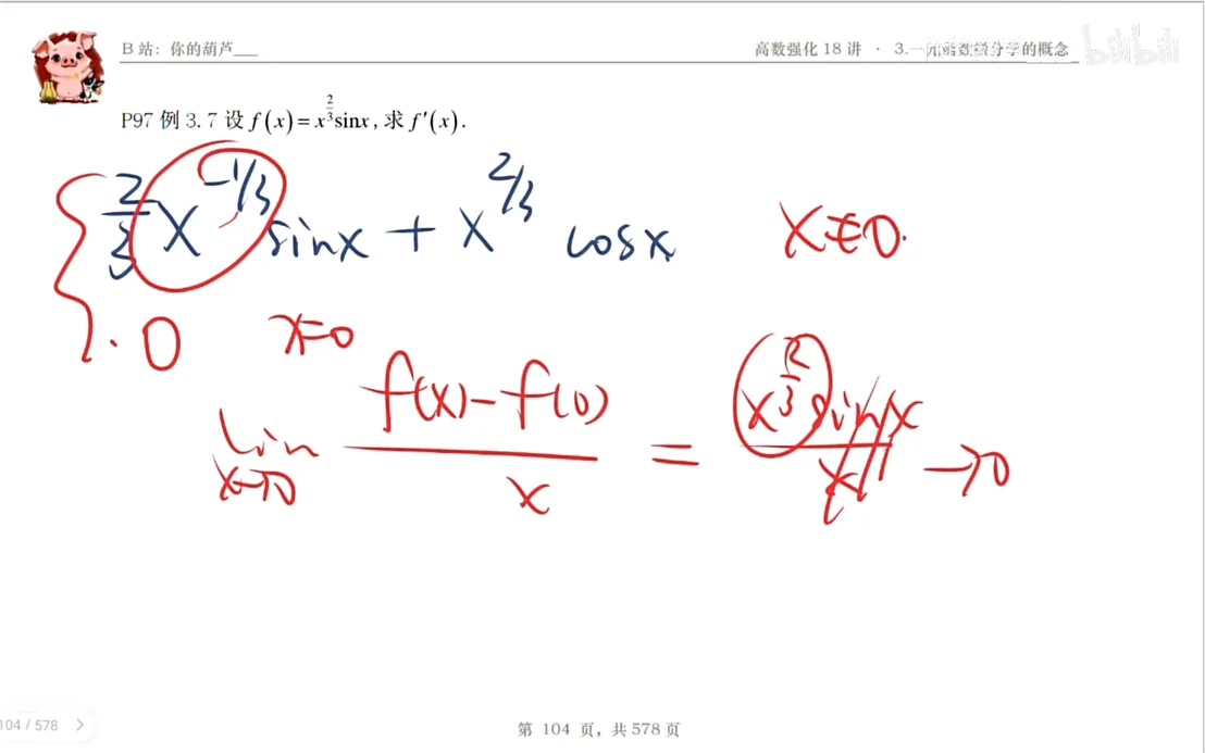 例3.7 题目 Q:P97 设 ,求 . 分析 A:出现幂上的求导,尤其是当这个区间时 要注意它作为分母的时候,这个是不能为0的,也就是求导前后的定义域是有区别的 要用求导的定义来特别地判定一下 解 【解】当 时, ,又 所以 【注】若由 ,且该式在 处无定义,得出 不存在,这无疑是错误的. 道理在上面已经讲了. 此处还有一个 “赠品”: 若 在 处不可导,但 在 处可能是可导的. “