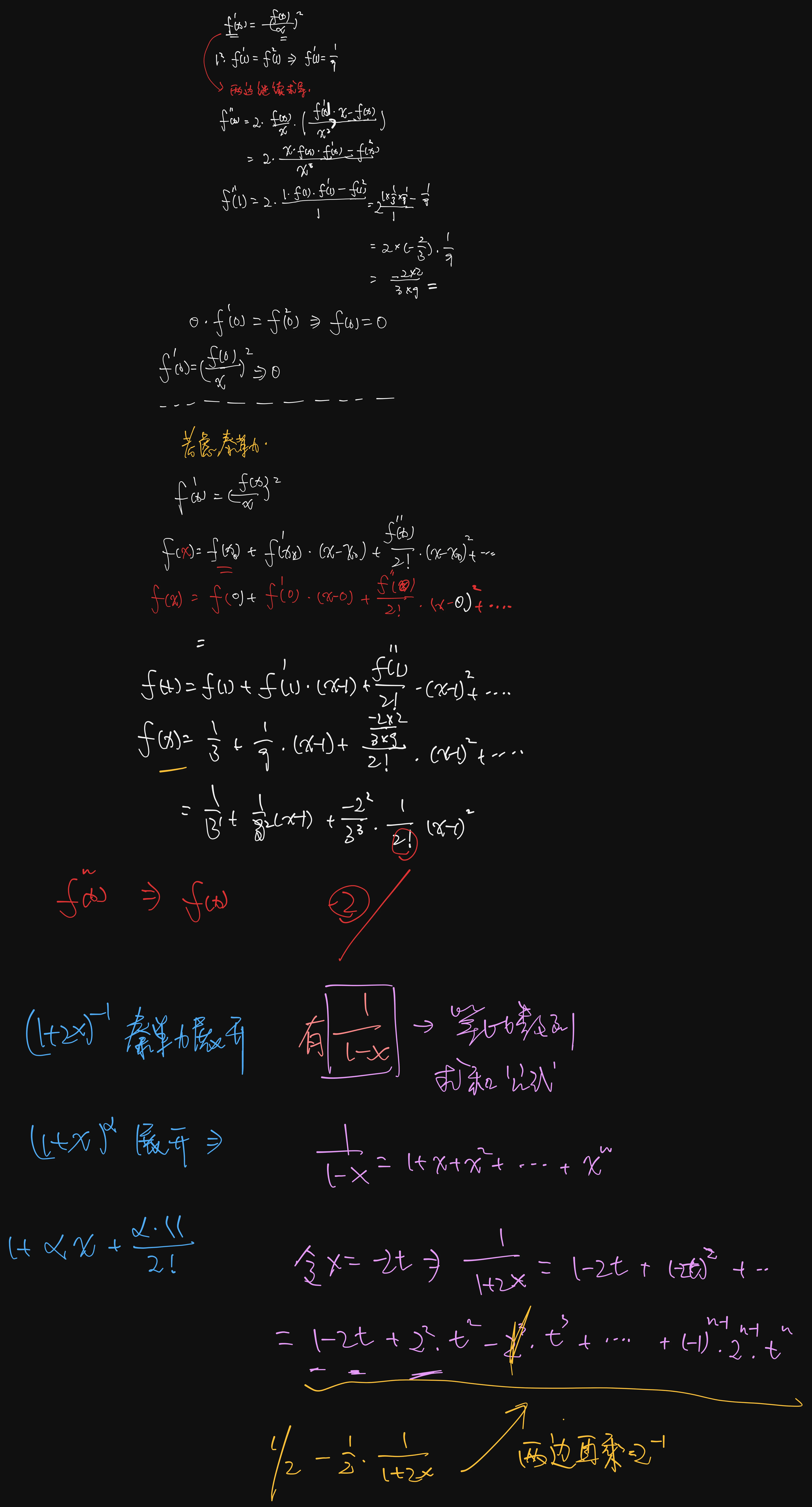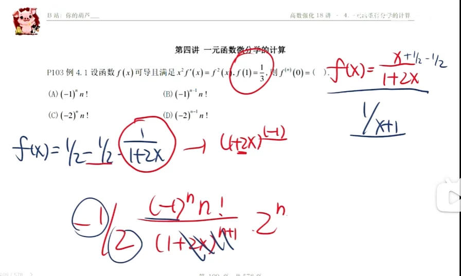 例4.1 题目 Q:P103 设函数 可导且满足 ,则 . (A) ! (B) ! (C) ! (D) ! 分析 A:可以先带入两项看看什么情况,发觉不太对劲,考虑用泰勒公式,因为这里既给了又给了 我的思路错了,显然这是可以分离变量的一阶线性微分方程,可以把解出来,题目里面在1处这个就是用来解微分方程的 值得注意的是的泰勒是等比数列求和公式 这是泰勒展开式的唯一性来求高阶导数 解 【解】应选(D). 是一个变量可分离型方程,分离变量得 两边积分, 得 故方程通解为 由 ,得 ,故 从而