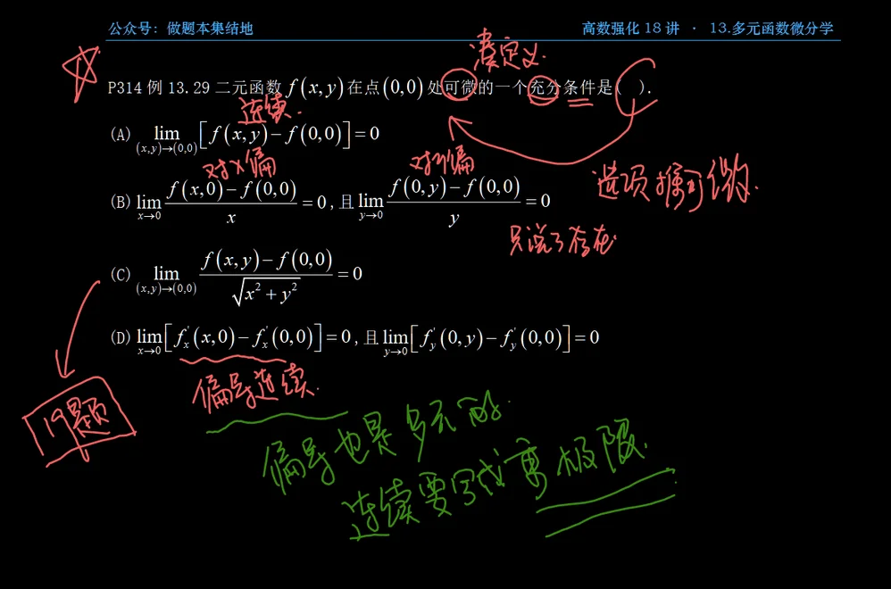 例13.29 题目 Q:P314 二元函数在点处可微的一个充分条件是( ). (A) (B),且 (C) (D),且 分析 A:还是和例13.19对比放在一起看,C选项又是这个全微分的重要,要注意D这个描述,全称描述的是一个一元的极限,偏导数要说连续,还是得回到偏导数也是多元函数上,用重极限来表示 解