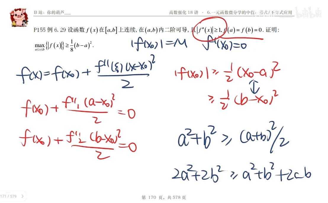 例6.29 题目 Q:P155 设函数 在 上连续,在 内二阶可导,且 . 证明: . 分析 A:注意形如:或者这种结构,这和有最大值,最小值,或者说有极值的描述是等价的 考虑泰勒公式展开的点的优先级:极值点>=驻点>=中点=有额外条件的端点>端点。这里就是在极值点这里展开,因为题目给了最值上的描述 这里端点给了信息,优先级要提前 同样最后又用了绝对值不等式和均值不等式来凑题目里面的目标 解