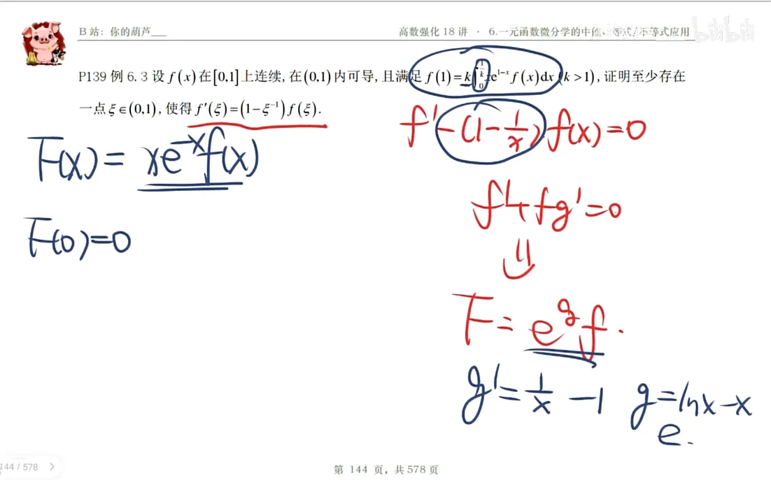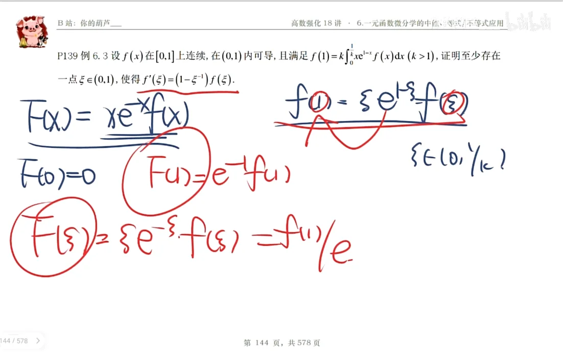 例6.3 题目 Q:P139 设 在 上连续,在 内可导,且满足 ,证明至少存在一点 ,使得 . 分析 A:这里是乘积的积分,考虑定积分的中值定理 根据积分中值定理,存在 , 使得: 由于 , 因此上式可以简化为: 最终,我们就得到了: 这个中值定理,沟通了两个点的信息,一个是一个是 解 为了使用微分中值定理,构造辅助函数 , 容易发现: 对函数 求导,得到 将 代入,可以得到 根据罗尔定理,存在 使得 , 即 化简可得