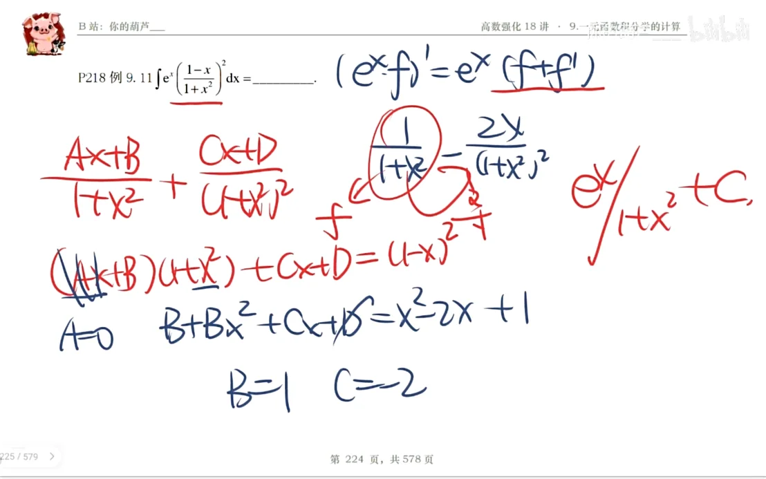 例9.11 题目 Q:P218 分析 A:应该以微分方程的视角来看,因为这个结构的原函数求导积分都带着,或者说原函数的,求导以后就是被积函数,形如,这也就说明应该满足,只需要和对应,就可以解出来这个 解 尝试用部分分式积分法给这个做裂项,得到,发现左边的求导就是右边的,分别对应和
