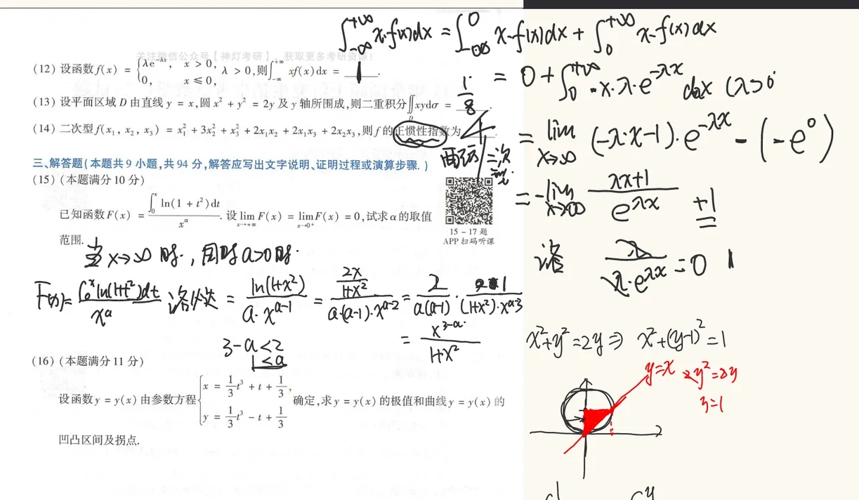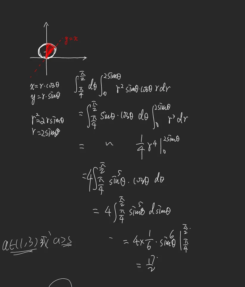 题13 题目 [!question]+ 设平面区域 由直线 ,圆 及 轴所围成,则二重积分 分析 [!NOTE]+ 这里积分区域当时画错了,我把y轴看成了x轴,如果是y轴的话还是极坐标算二重积分方便一些 解 [!done]- 在极坐标系下,圆方程 化为 ,化简得到 . 直线 的方程化为 轴方程化为 . 从而可写出区域 的表示. 因此,