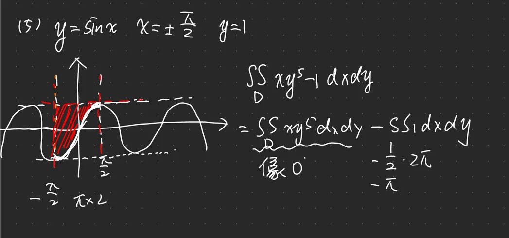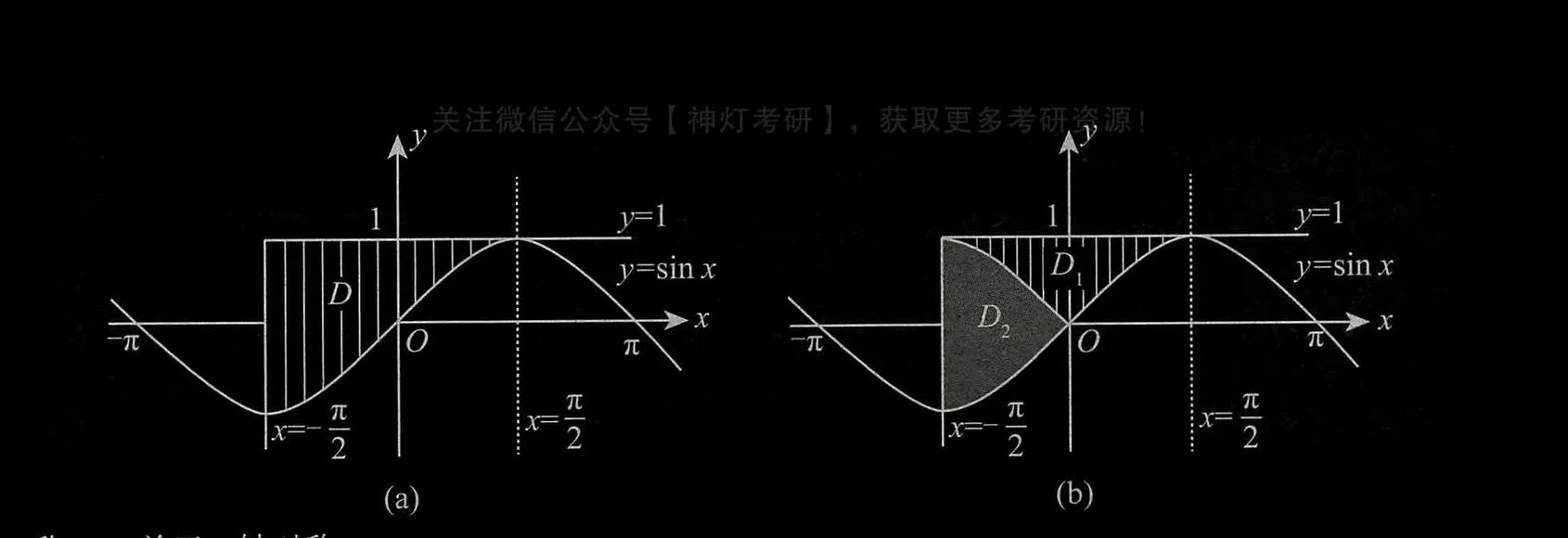 题6 题目 [!question]+ 设区域 由曲线 围成,则 (A) . (B) 2 . (C) -2 . (D) . 分析 [!NOTE]+ 解 [!done]- 若 为关于 的奇函数,而区域 关于 轴对称,则 ; 若 为关于 的奇函数,而区域 关于 轴对称,则 . (解) 区域 如图 (a) 所示. 如图 (b) 所示,将 分为两部分, 由 , 在 上的一段围成. 由 围成. 关于 轴对称, 关于 轴对称. 由于 为关于 的奇函数,故 . 又由于 为关于 的奇函数,故 . 从而, . 将 写成 型区域, 因此, 应选 D. 注 为区域 的面积的负值. 通过割补法,我们发现,将 位于 轴下方的部分移到其关于原点对称的位置,可得一矩形. 的面积等于矩形面积. 该矩形由 轴, 以及 所围成,长为 ,宽为 1,面积为 .