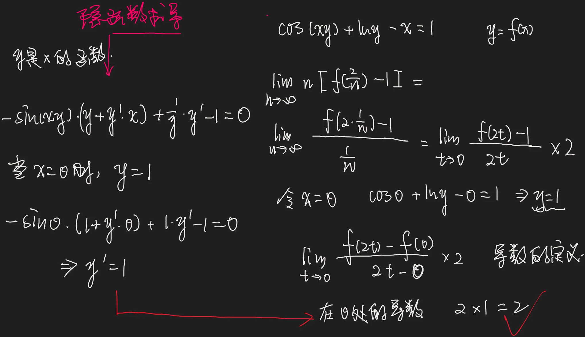 题2 题目 [!question]+ 设函数 由方程 确定,则 (A) 2 (B) 1 (C) -1 (D) -2 分析 [!NOTE]+ 解 [!done]- 解 将 代入方程 可得, . 对方程 两端关于 求导可得 代入 ,可得 . 由导数的定义可得, 应选 A. (1) 式倒数第二个等号成立要求 存在.