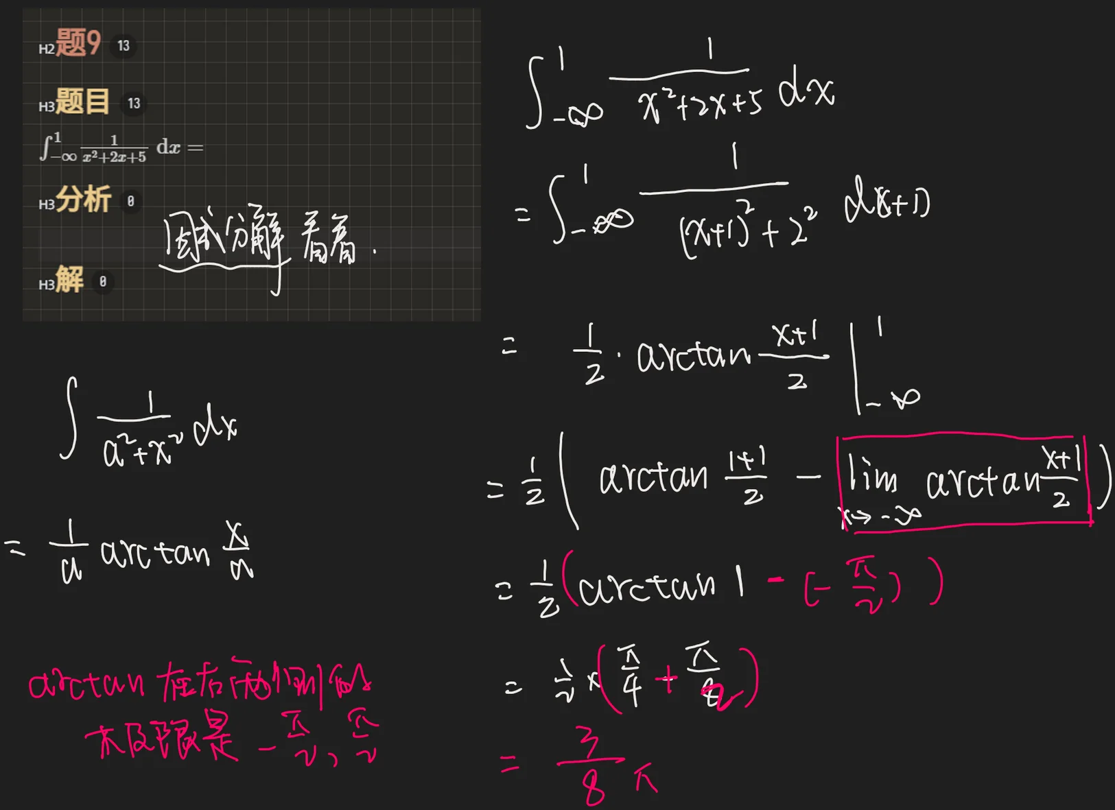 题9 题目 [!question]+ Q: 分析 [!NOTE]+ A:arctanx在负无穷和正无穷的极限我不知道,应该是 解 [!done]- 解 对被积函数的分母配方. 注 arctan 的值域为 .