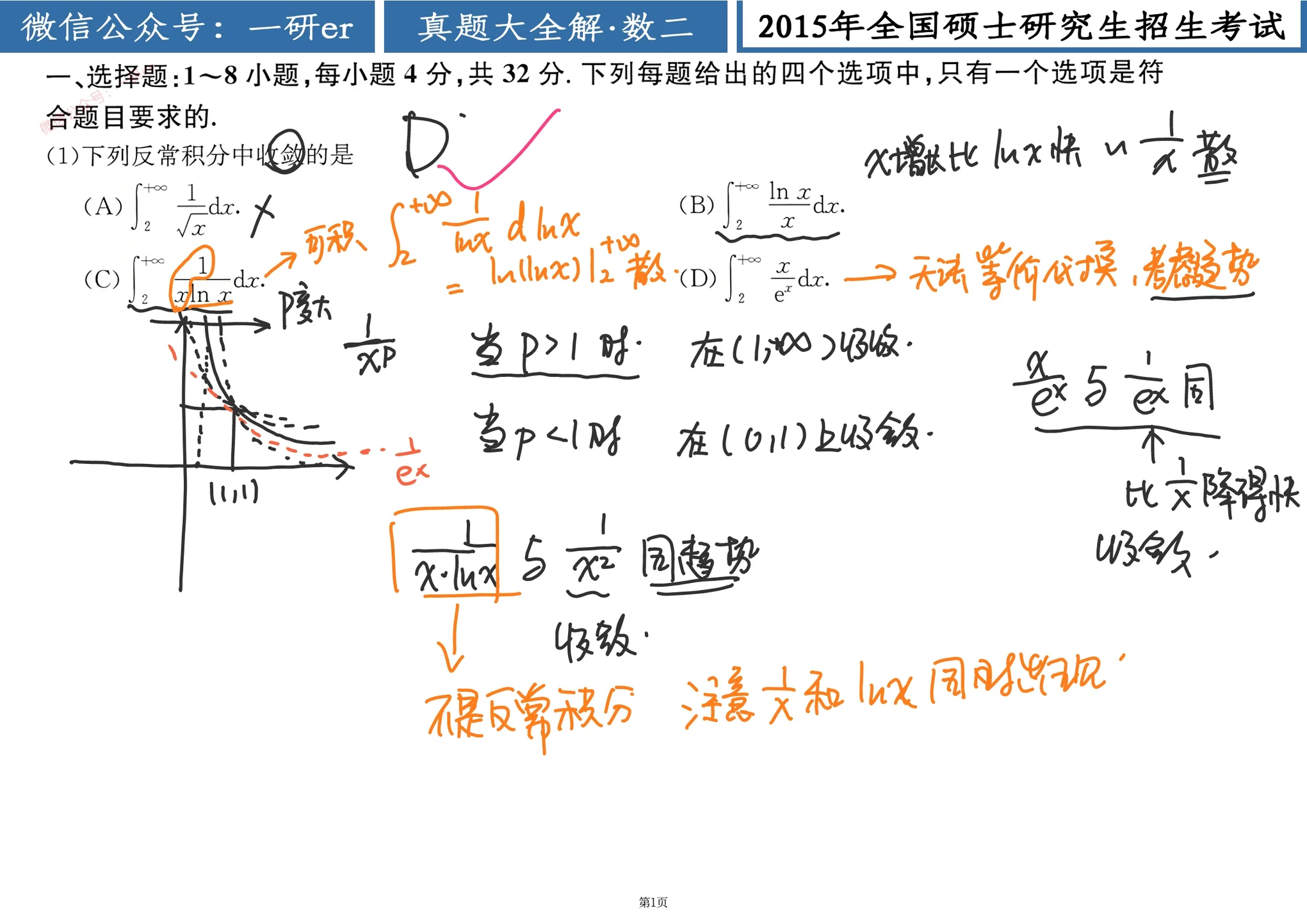 题1 题目 [!question]+ 下列反常积分中收敛的是 ( ) (A) . (B) . (C) . (D) . 分析 [!NOTE]+ 这个题我们做过:题3,需要注意的是反常积分这里要确定,是不是反常积分,特别是,B选项这种,这里同时出现了和,这种情况下,我们需要考虑一下,是不是要分部积分,可以把这个函数积出来 解 [!done]- 解 由于各选项中的积分都不太复杂, 故可先积分, 再讨论极限. 综上可知,应选 D.