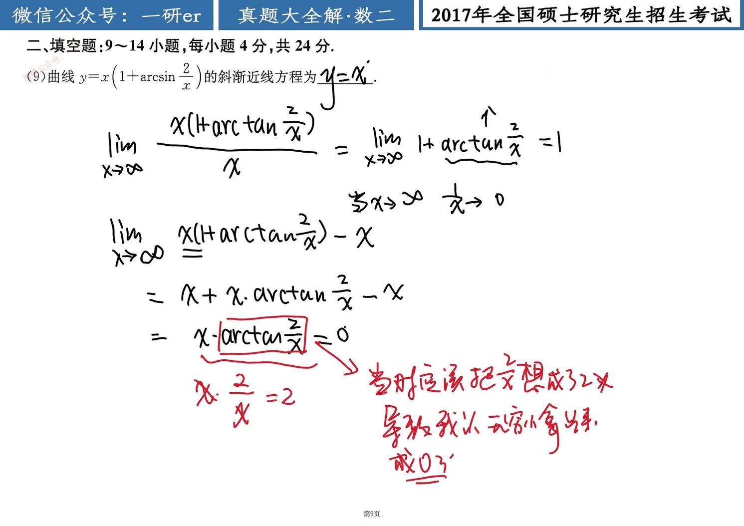 题9 题目 [!question]+ (9) 曲线 的斜渐近线方程为___. 分析 [!NOTE]+ 反三角函数的arctanx,在无穷远的地方被当作是一个有界量,通常和一个无穷小量在一起然后极限在无穷远处趋于0,也就是无穷小乘有界,但是这里应该直接用等价无穷小量,这里我想岔开了导致计算结果 解 [!done]- 对曲线 ,若 ,则直线 为 的斜渐近线. 解 计算 . 计算 . 因此,斜渐近线方程为 . 注 上述解法用到了 . 对这一等价无穷小量不熟悉的同学也可以使用洛必达法则来求 . 洛必达