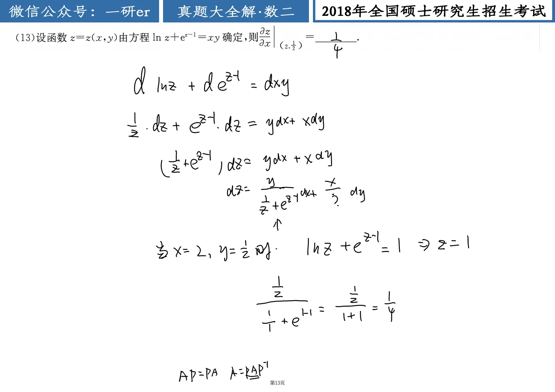 题13 题目 [!question]+ 设函数 由方程 确定,则 分析 [!NOTE]+ 解 [!done]- (解) (法一) 对已知方程两端关于 求导,可得 . (1) 将 代入已知方程可得,。解得 。 将 代入(1)式可得,,即 。 (法二) 记 ,则 ,。 将 代入已知方程可得,。解得 。 根据隐函数存在定理, .