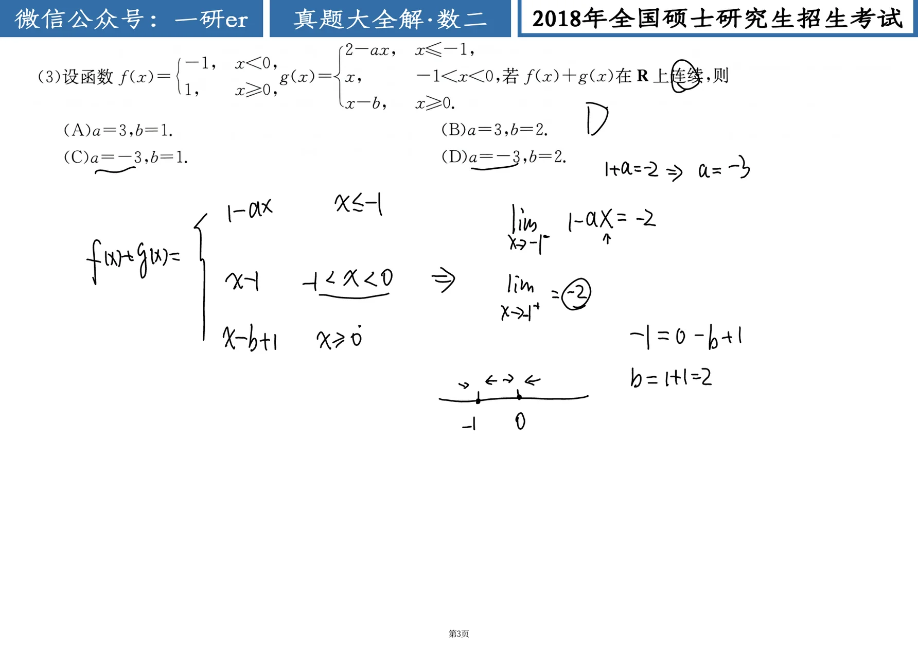 题3 题目 [!question]+ 设函数 若在上 连续, 则 ( ) (A) (B) (C) (D) 分析 [!NOTE]+ 解 [!done]- 都是分段函数, 考虑的连续性时, 应考虑在的分界点处的连续性. 有一个分界点; 有两个分界点. 解 当时, . 当时, . 当时, . 于是, 由于在上连续, 故在和处均连续. 因为, 而, 所以, 即. 又因为, 而, 所以, 即. 因此, .