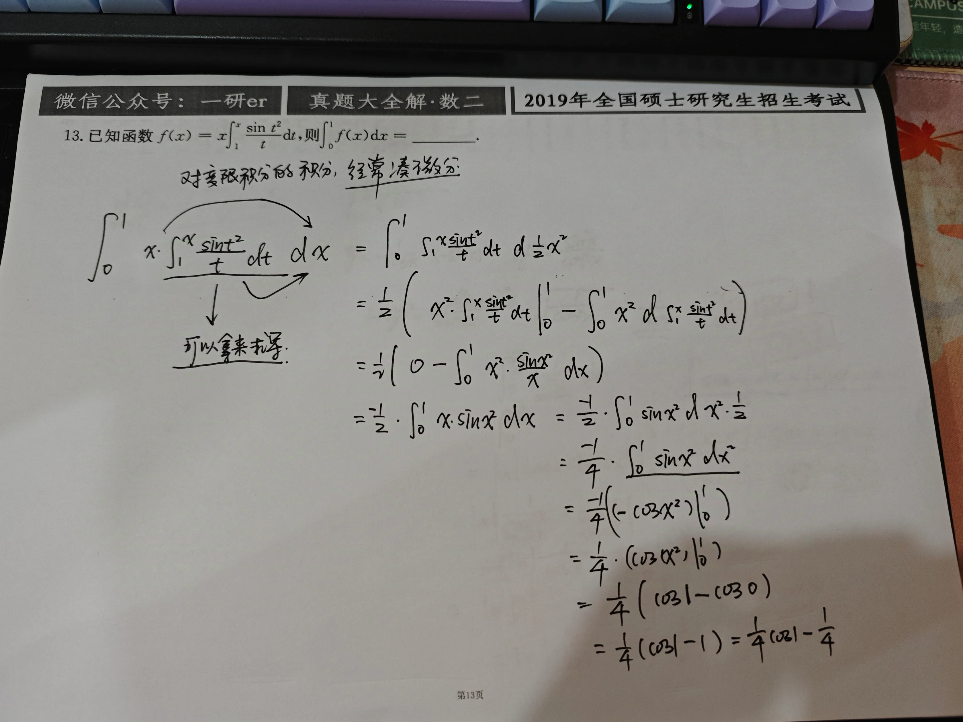 所求积分的被积函数不是初等函数(比如这里就是变限积分), 需对其进行转化. 有两种转化方法: (1) 利用分部积分法; (2) 利用交换二次积分的积分次序。变限的x可以看作是穿入穿出的界,这种手法我个人实操得不多