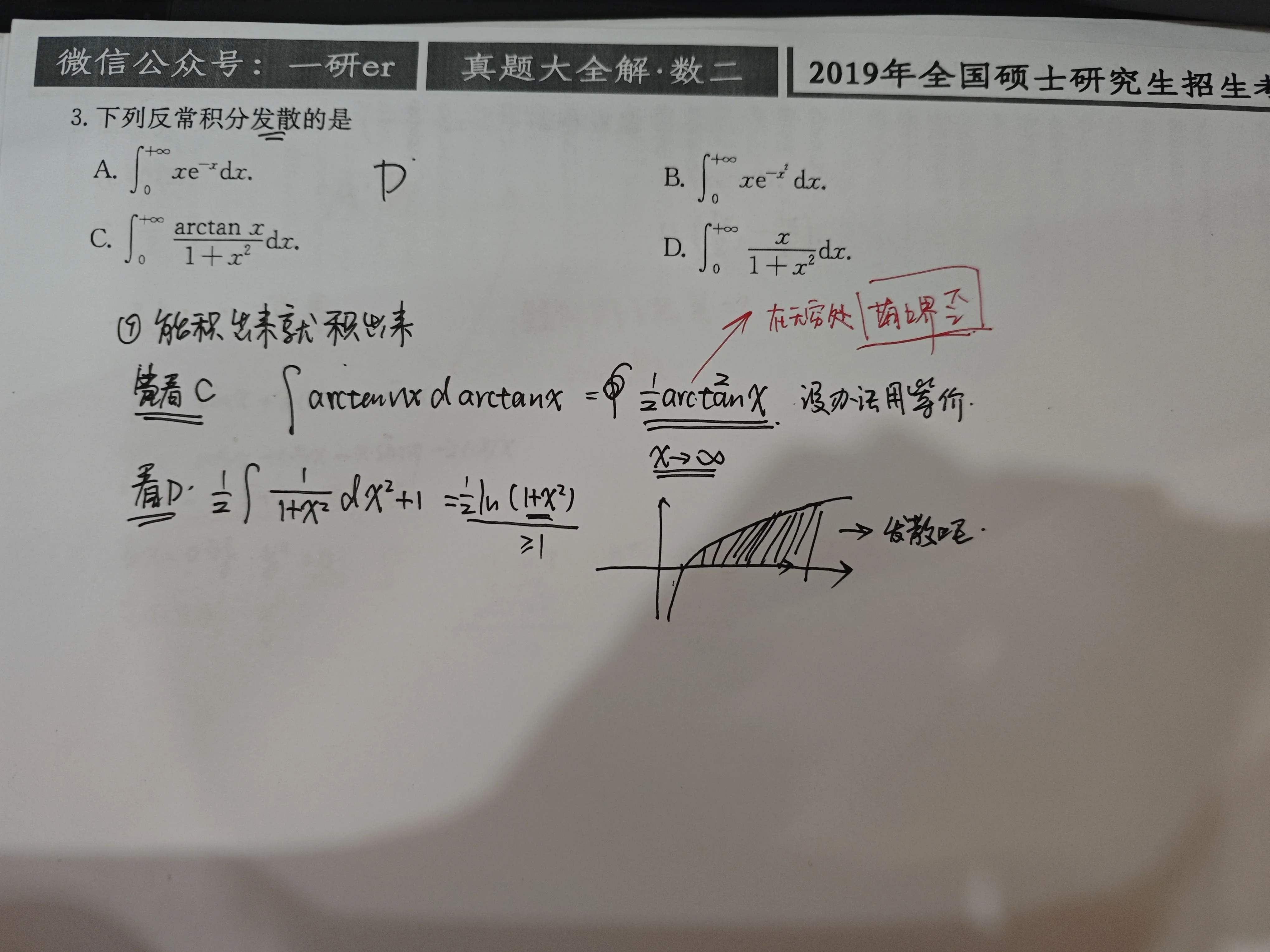 题3 题目 [!question]+ 下列反常积分发散的是 ( ) (A) . (B) . (C) . (D) . 分析 [!NOTE]+ 反常积分是否收敛,要是能积分就先积分出来看看,注意arctan这个反三角函数在无穷处极限是pi/2 解 [!done]- 本题中的四个反常积分都较简单, 可以先计算定积分再取极限来判定其敛散性. 解 由于各选项中的积分都不太复杂, 故可先积分, 再讨论极限. 综上所述, 应选 D.
