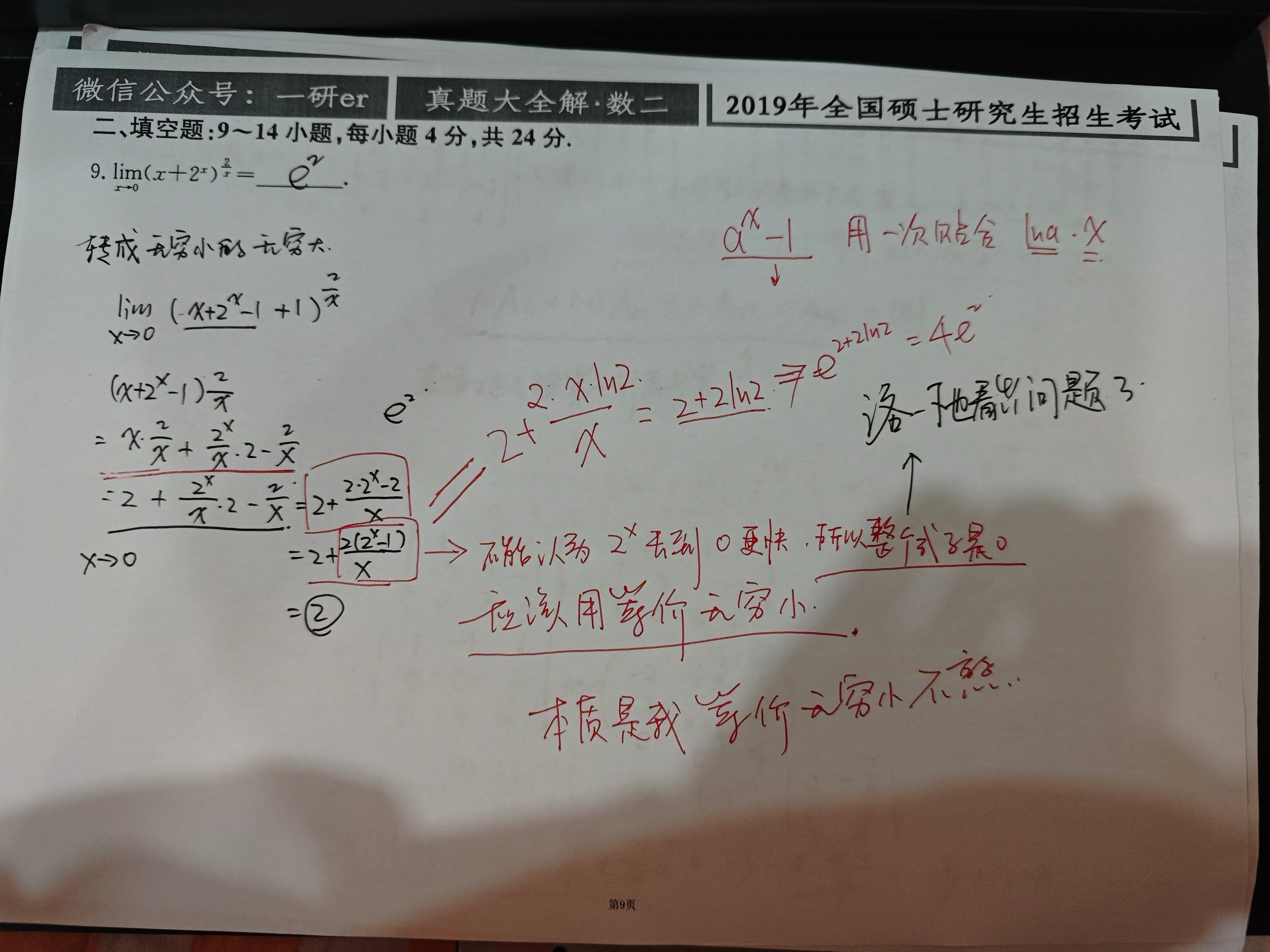 题9 题目 [!question]+ Q:(9) 分析 [!NOTE]+ A:无穷小的无穷大次,另一方面,又是对这个指数函数积分与求导还有等价无穷小不熟悉,比如这里的求导应该是,这里的求导应该是,有一个等价无穷小是, 解 [!done]- 解 (法一) 凑重要极限. 计算 . 因此,原极限 .