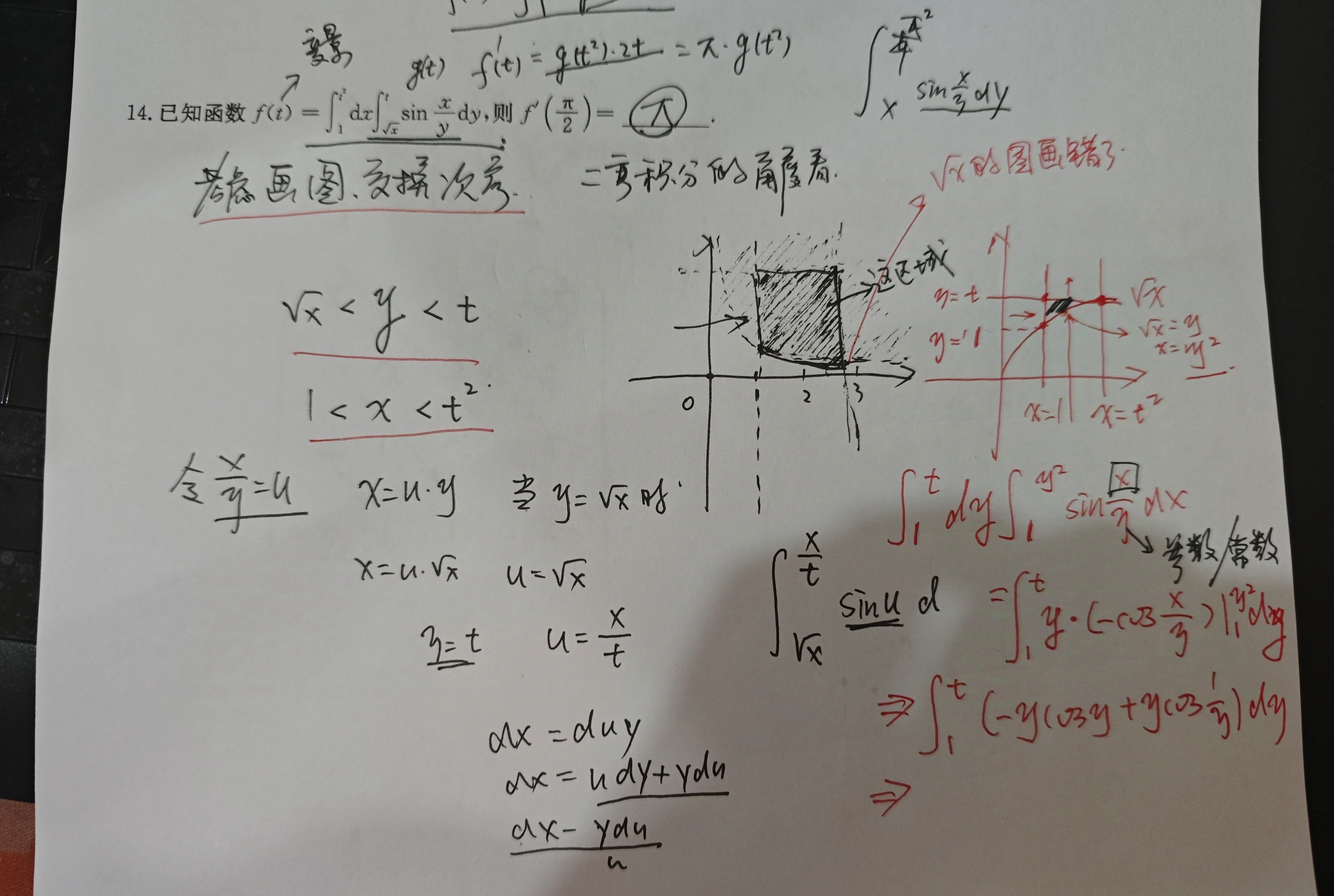题14 题目 [!error]+ Q:已知函数 ,则 分析 [!NOTE]+ A: 由二次积分给出,而根据原积分次序较难计算得到 ,故可以考虑交换二次积分的积分次序之后再计算 . 这里做错了,主要是因为的图画错了 解 [!done]- 解 根据二次积分的积分限,可得积分 对应的积分区域的边界为 , 二次积分对应的积分区域 为图中阴影部分,写成 型区域为 交换积分次序,将 写成 型区域,可得 因此, 根据变限积分的求导公式, 代入 ,可得 .