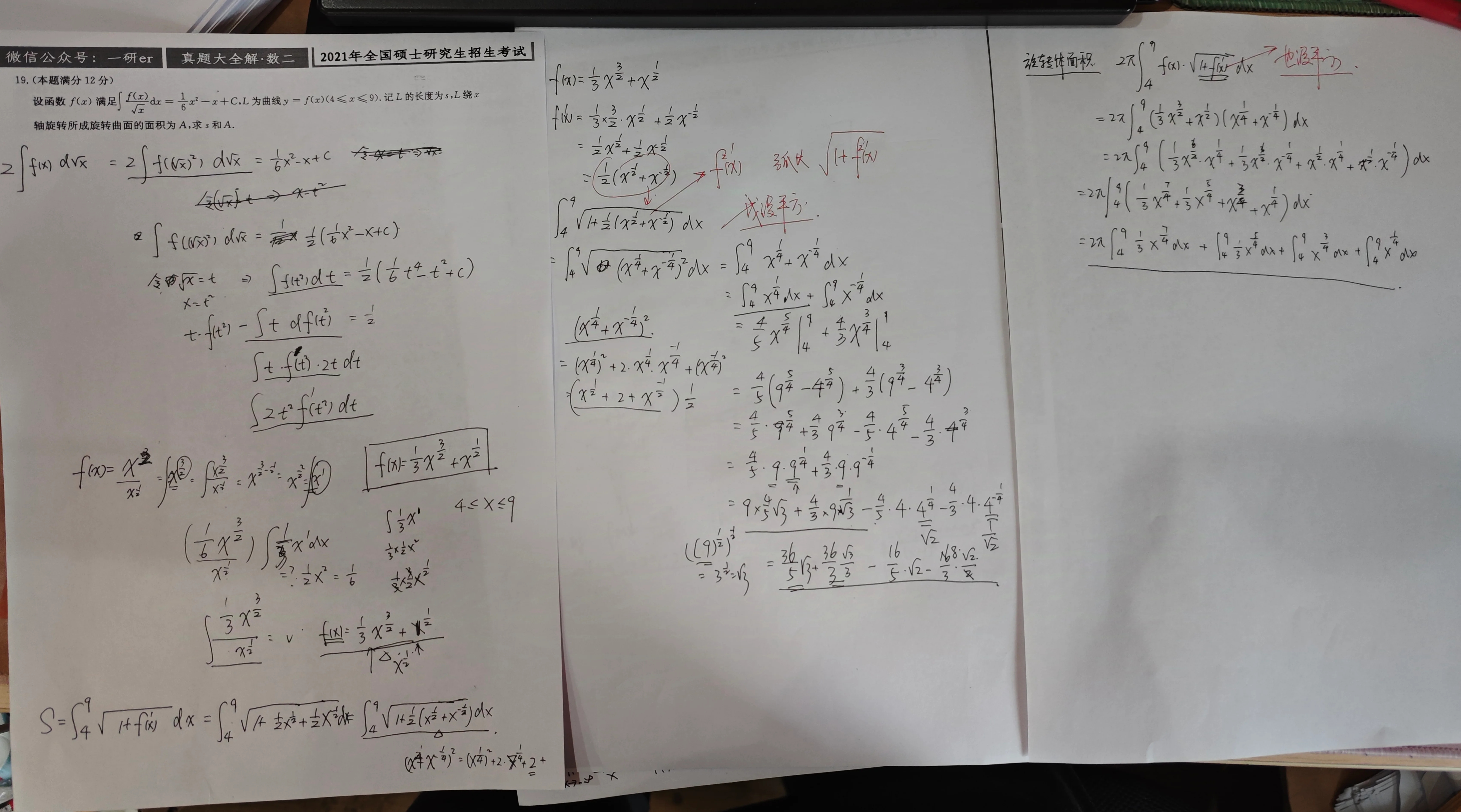 题19 题目 [!error]+ 设函数 满足 为曲线 的弧长为 绕 轴旋转一周所形成的曲面面积为 ,求 和 . 分析 [!NOTE]+ 这个题目的错误属于是算错了,也算是粗心吧,不是说有什么知识性的错误存在 注意算曲线的弧长要给导函数平方,这里忘记了,还有旋转体侧面积,这个我也容易忘 解 [!done]- 解 两端关于 求导,可得 . 于是, . 的弧长为 绕 轴旋转一周所形成的曲面面积为
