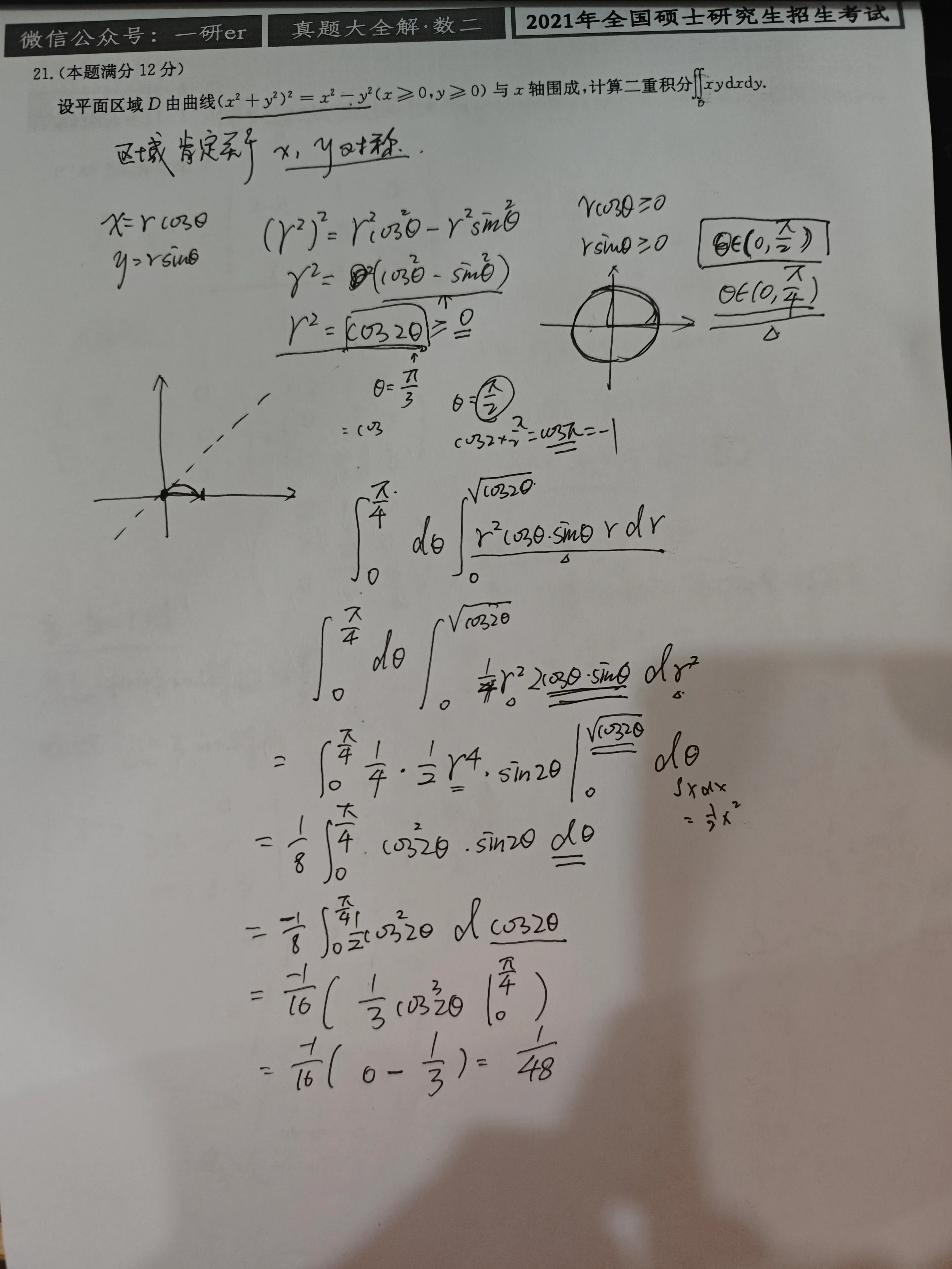 题21 题目 [!question]+ 曲线 与 轴围成的区域为 ,求 . 分析 [!NOTE]+ 解 [!done]- 解 曲线 与 轴围成的区域 如图所示. 写出曲线 的极坐标方程. 将 代入 可得, ,即 . 于是,区域 的极坐标表示为 因此, 极坐标