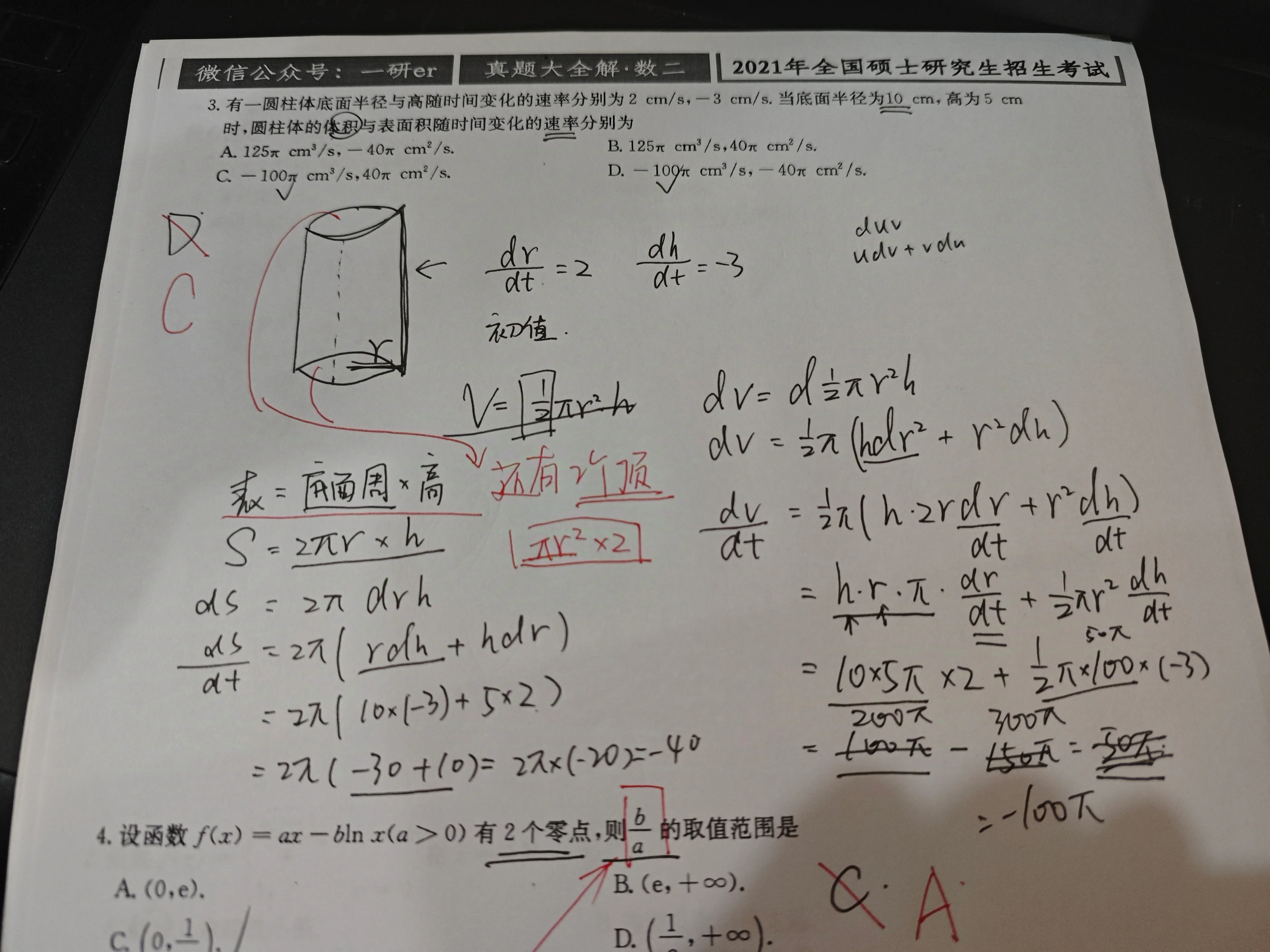 题3 题目 [!question]+ 有一圆柱体,底面半径与高随时间变化的速度分别为 ,当底面半径为 , 高为 时,圆柱体的体积与表面积随时间变化的速度分别为 ( ) (A) . (B) . (C) . (D) . 分析 [!NOTE]+ 这里忘记了上下两个顶面的面积,也是属于计算错误 解 [!done]- 解 设圆柱体的底面半径为 ,高为 ,则圆柱体的体积 ,表面积 由链式法则, 代入 可得 因此,应选 C.