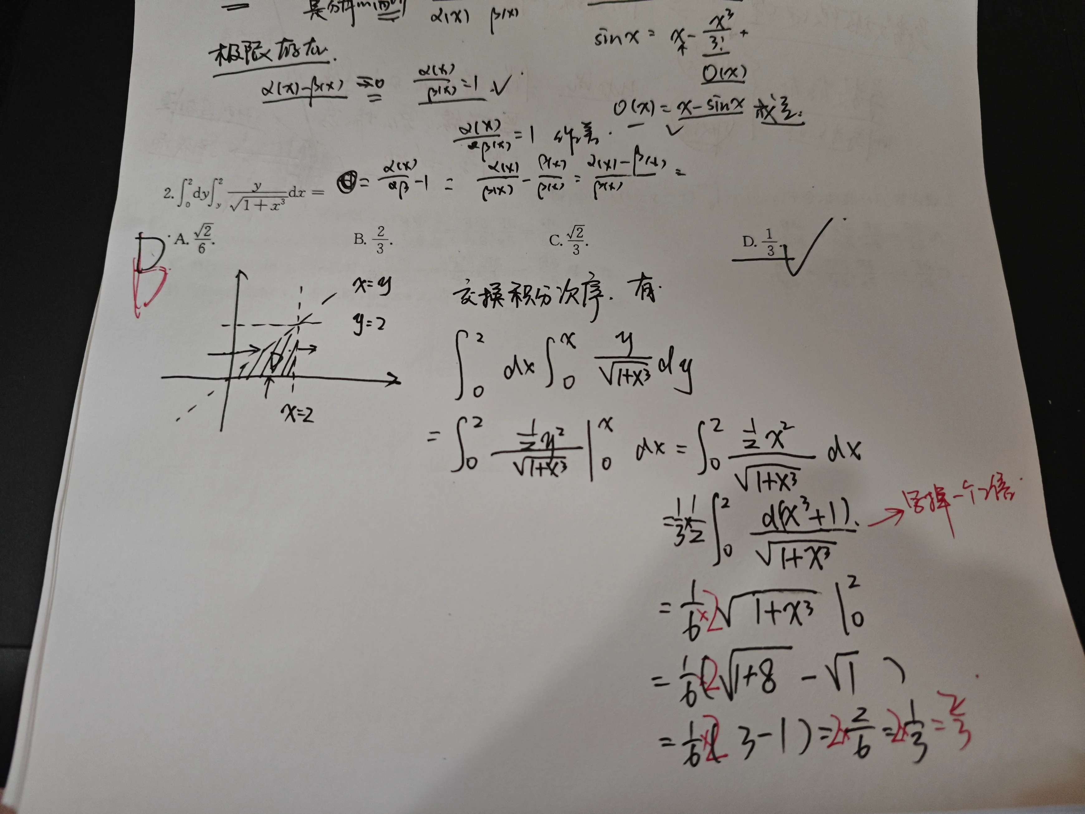 题2 题目 [!question]+ (A) . (B) . (C) . (D) . 分析 [!NOTE]+ 解 [!done]- 解 如图 (a) 所示,二次积分对应的积分区域 是由直线 以及 轴所围成的三角形区域. 原二次积分采用的是先 ,后 的积分次序,改写成先 ,后 的积分次序,即将 写成 型区域, 如图(b) 所示. 因此, 原积分 应选 D.
