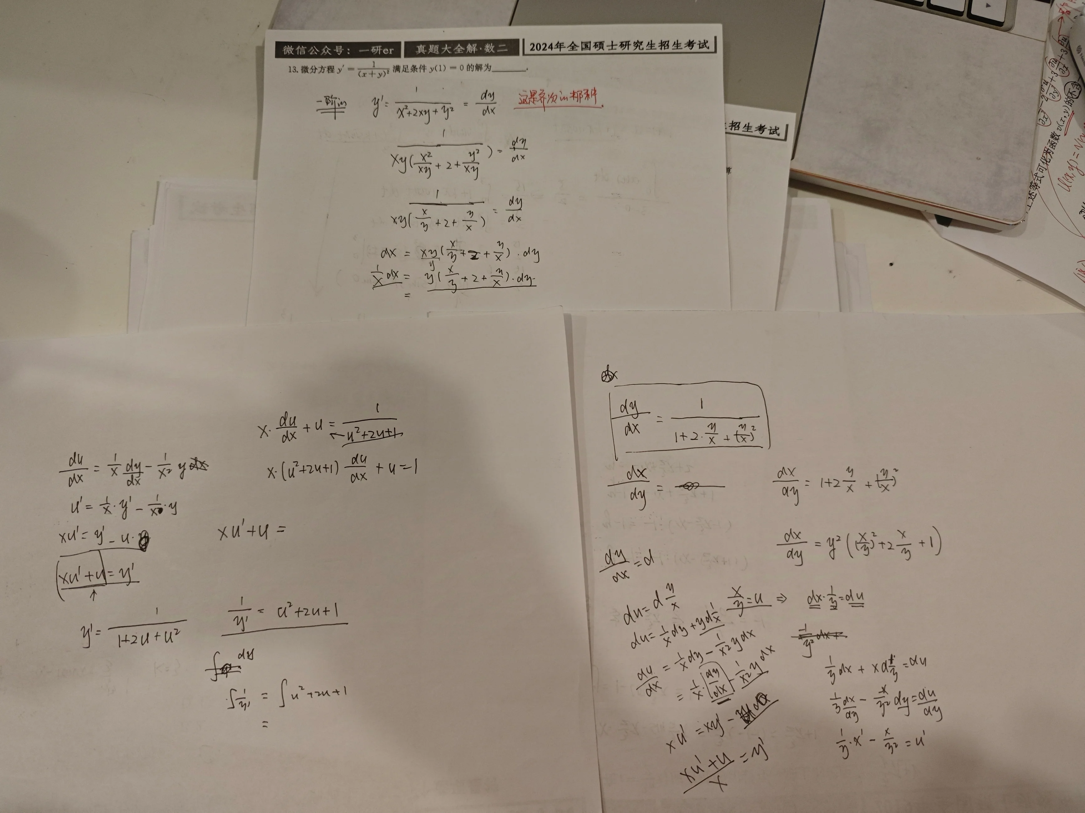 题13 题目 [!error]+ 微分方程满足初始条件的解为 分析 [!NOTE]+ 我以为是一阶齐次微分方程,所以一直在用进行换元,结果不是,这是一个小众一点的换元,这里做错了不亏 解 [!done]- 本题中的微分方程是一阶微分方程,但并不是关于的一阶线性微分方程,不能直接用公式求解,故考虑通过换元将其化为我们熟悉的微分方程类型。 解 令 ,则 ,原方程化为 ,即 。 这是一个可分离变量的微分方程,分离变量可得 。方程两端同时积分可得 。由 可得,。代入 可得 ,解得 :于是,。 将 代回 并整理可得 。