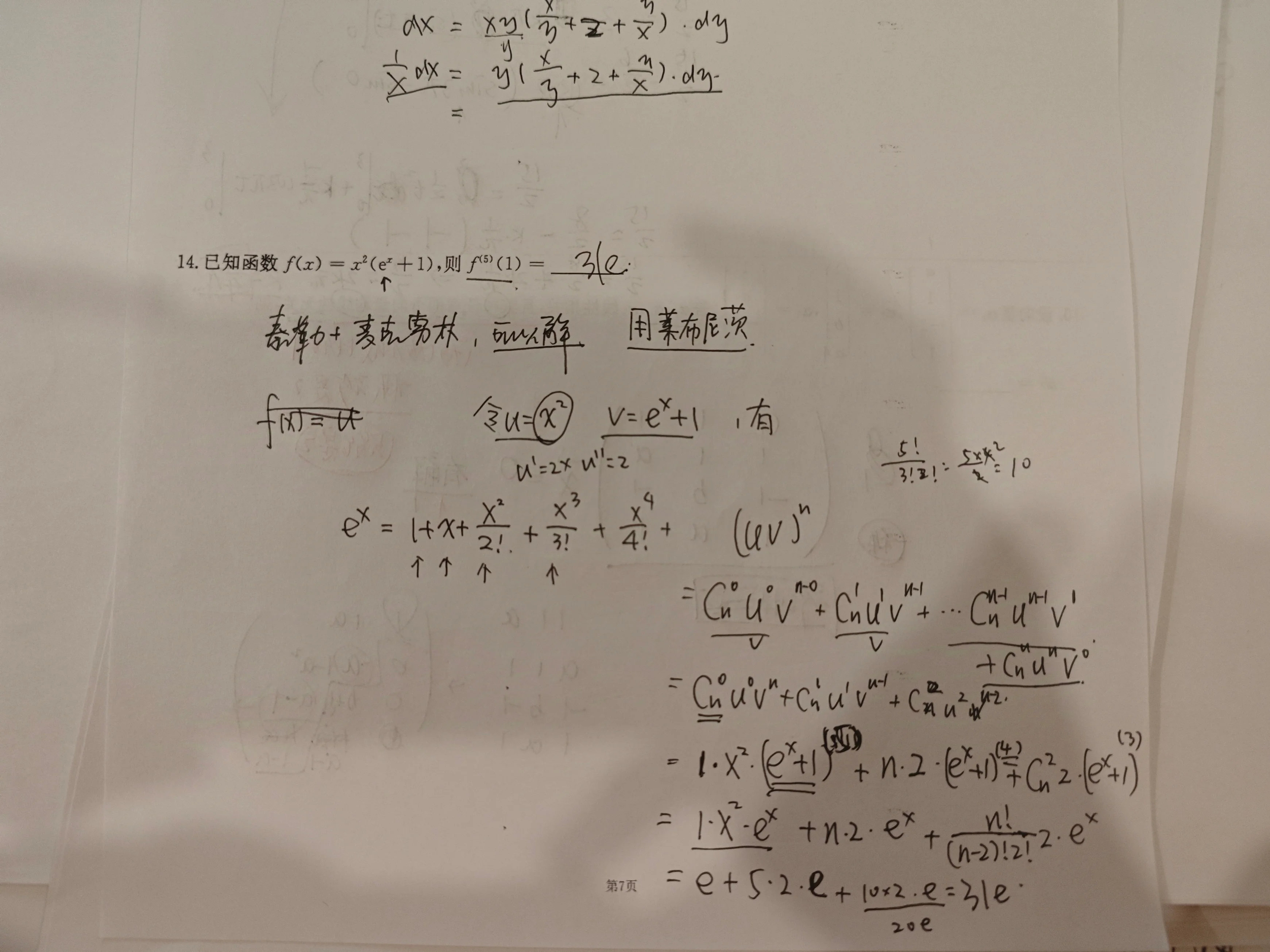 题14 题目 [!question]+ 已知函数,则 分析 [!NOTE]+ 应该是莱布尼兹公式 解 [!done]- 可以看作 与 的乘积,当 时,,故求 的高阶导数,可以使用莱布尼茨公式。 莱布尼茨公式 若 ,则 解 记 ,则当 时,,,,当 时,。由莱布尼茨公式可得, 当 时,.