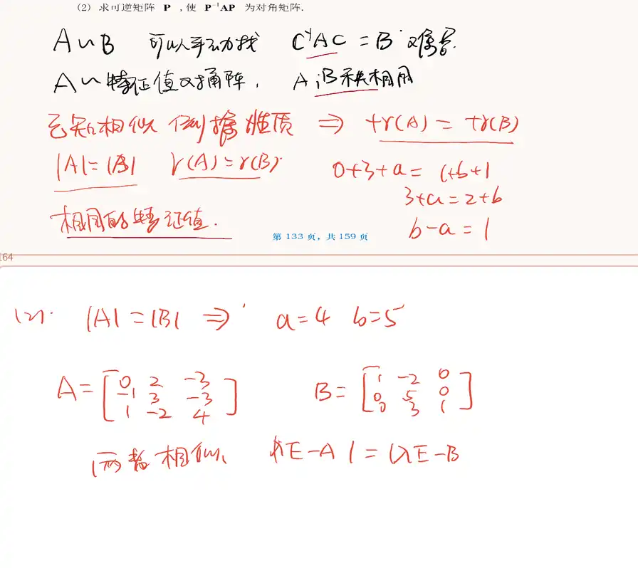 题5.11 题目 Q:设矩阵 相似于矩阵 (1)求 的值; (2)求可逆矩阵 ,使 为对角矩阵. 分析 A:这个题是已知两矩阵是相似矩阵,倒推性质,建立方程 可以利用的性质 可逆矩阵. 已知矩阵 与 相似 于是 相似矩阵的性质: 特征值相同 行列式相同 解 page=133 5.11 由 两者相似,则 (2) 由 (1) 知 . 由于矩阵 与矩阵 相似,因此 故 的特征值为 .当 时,解方程组 ,得线性无关的特征向量 ; 当 时,解方程组 ,得特征向量 . 令 ,则 ,故 为所求可逆矩阵.