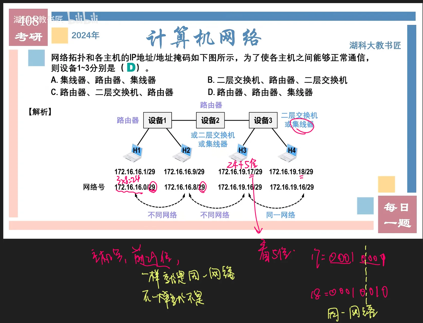 题11 题目 网络拓扑和各主机的P地址地址掩码如下图所示,为了使各主机之间能够正常通信,则设备1~3分别是() A.集线器、路由器、集线器 B.二层交换机、路由器、二层交换机 C.路由器、二层交换机、路由器 D.路由器、路由器、集线器 分析 同一网络我们用集线器,不同网络我们用路由器,看是不是同一个网络,我们看最大前缀,也就是/xx这个部分 解