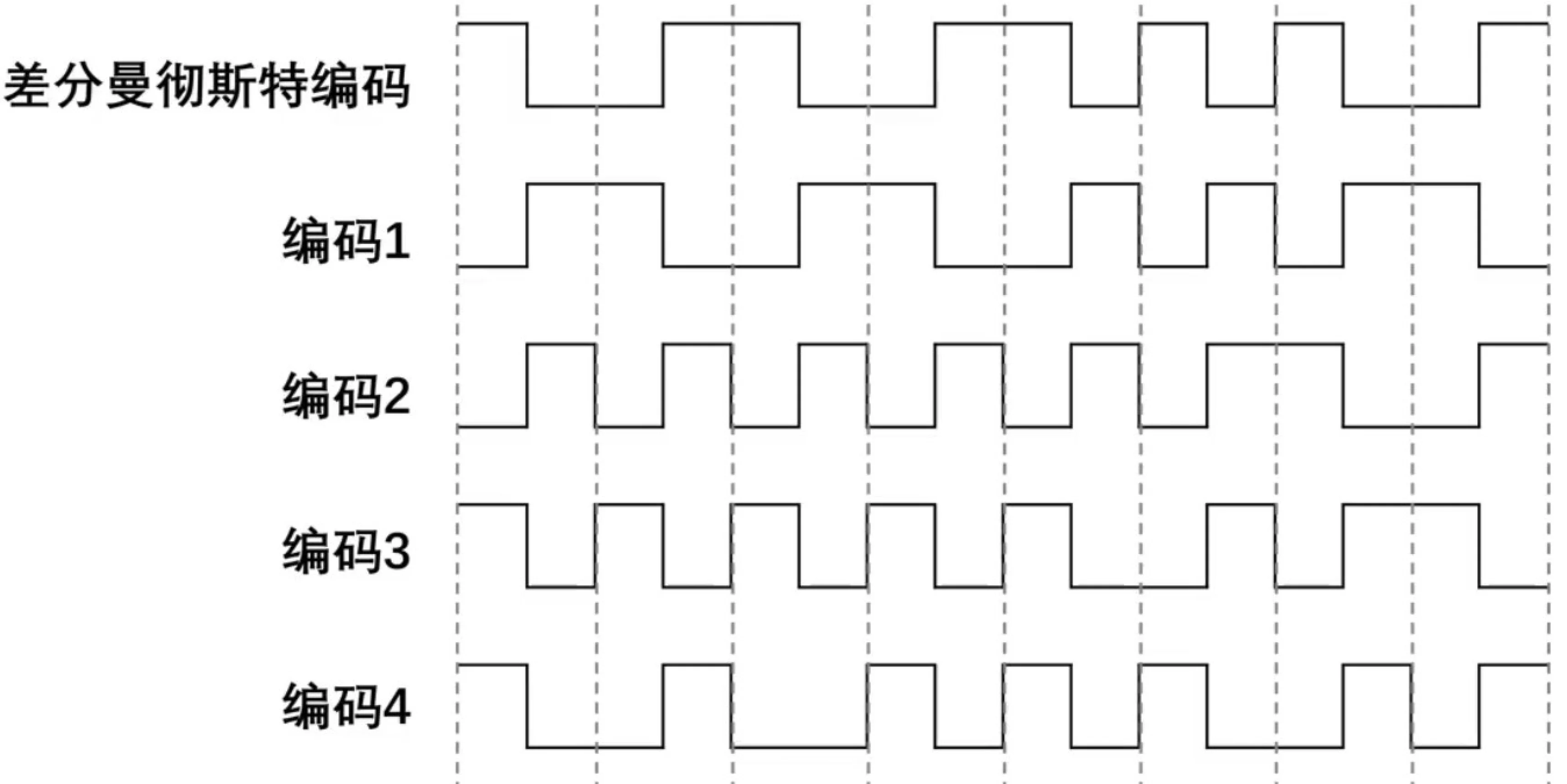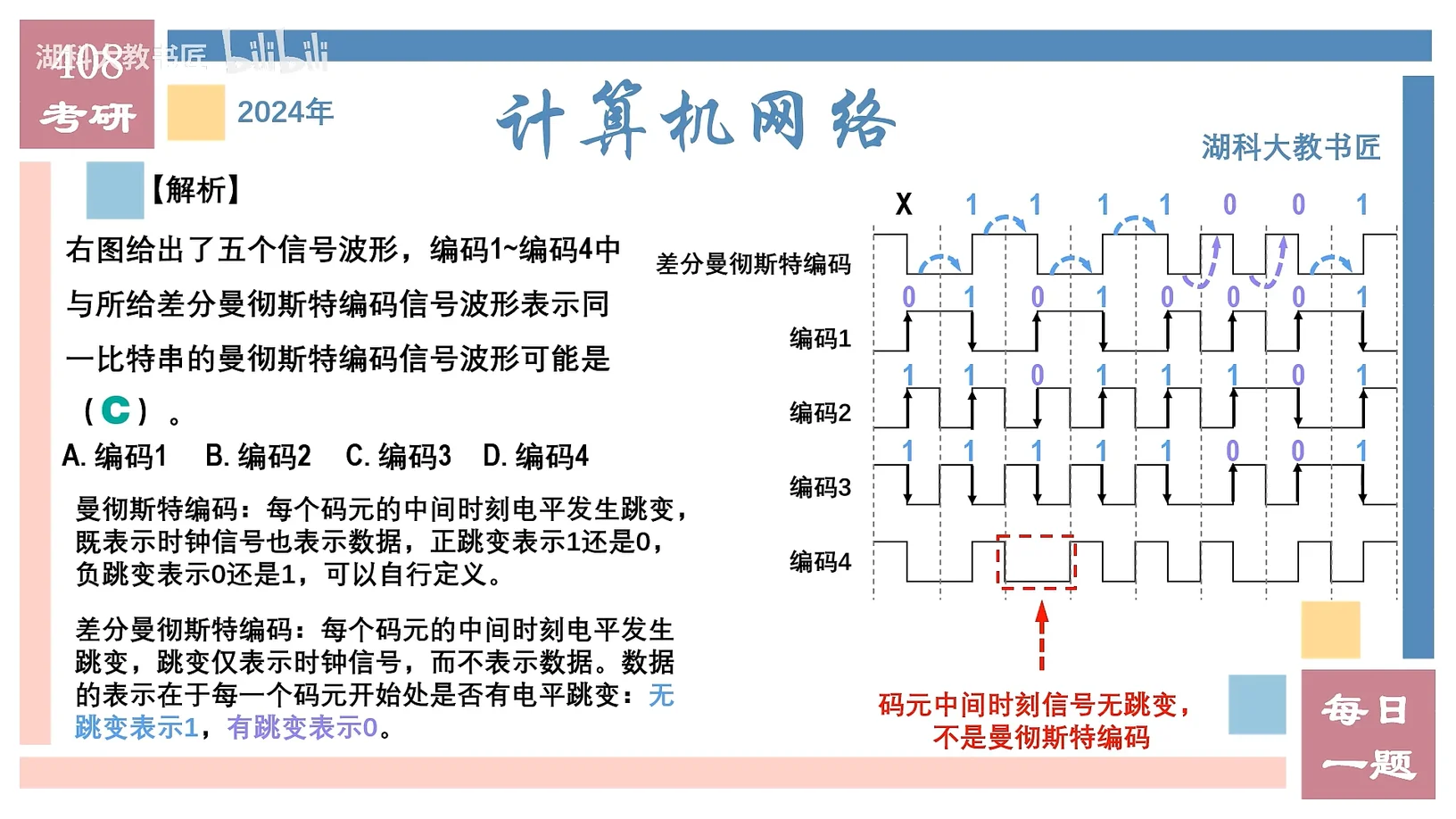 题4 题目 下图给出了五个信号波形,编码1~编码4中与所给差分曼彻斯特编码信号波形表示同一比特串的曼彻斯特编码信号波形可能是() A.编码 1 B.编码 2 C.编码 3 D.编码 4 分析 曼彻斯特编码和差分曼彻斯特编码都是看的两个码元的中间这里,严重误解!差分曼彻斯特编码看中间虚线,曼彻斯特编码看的是两个虚线夹着这个实线里面 解