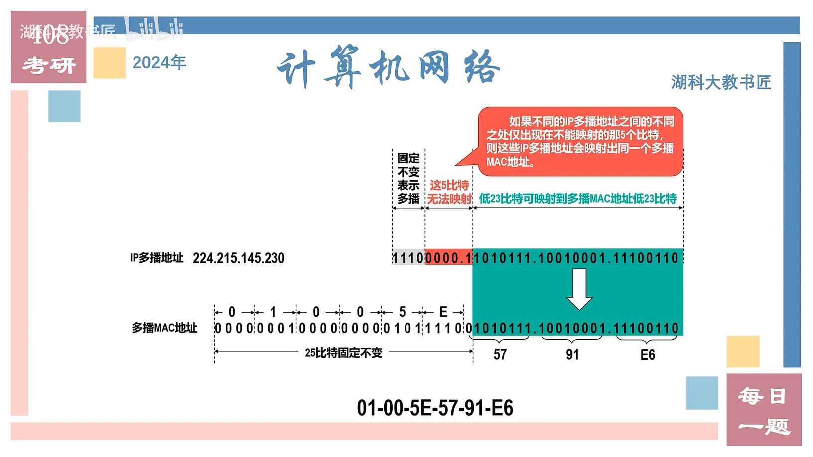 A:考察了MAC地址中映射的缺陷,IP多播地址到MAC地址,IP里面,头四位1110,表示多播,后面的五位,0000.1无法映射。这个映射只转换低32位。我们再在王道这里看一道题目:题3
