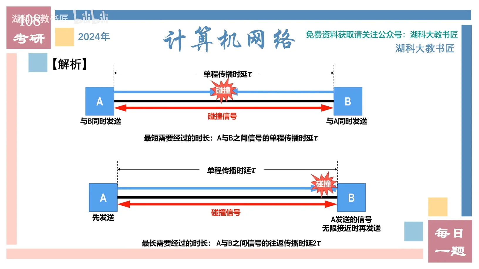 主机A和主机B分别位于某个总线型以太网的两端,它们之间信号的单程传播时延记为。假设A和B发送数据过程中,其他主机不发送数据。若A和B发送数据时发生冲突,则从开始发送数据时刻起,到A和B均检测到冲突时刻止,所需的最短时间和最长时间分别是()。