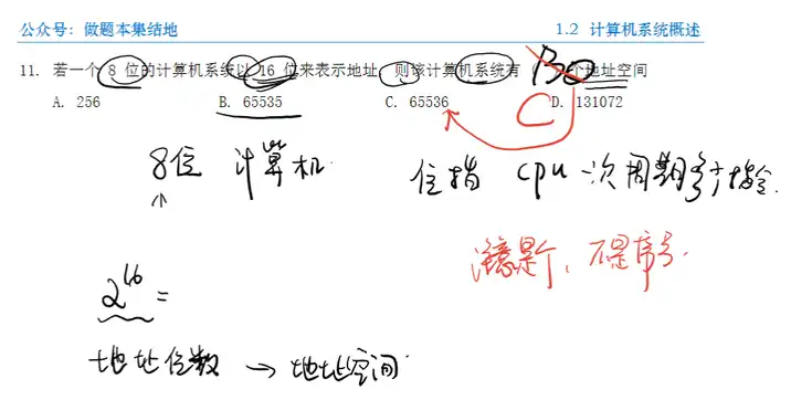 题11 题目 Q:若一个 8 位的计算机系统以 16 位来表示地址, 则该计算机系统有 ( ) 个地址空间 A. 256 B. 65535 C. 65536 D. 131072 分析 A:8 位计算机表明计算机字长为 8 位, 即一次可以处理 8 位的数据; 而 16 位表示地址码的长度, 因此该机器有 个地址空间。 解 选C