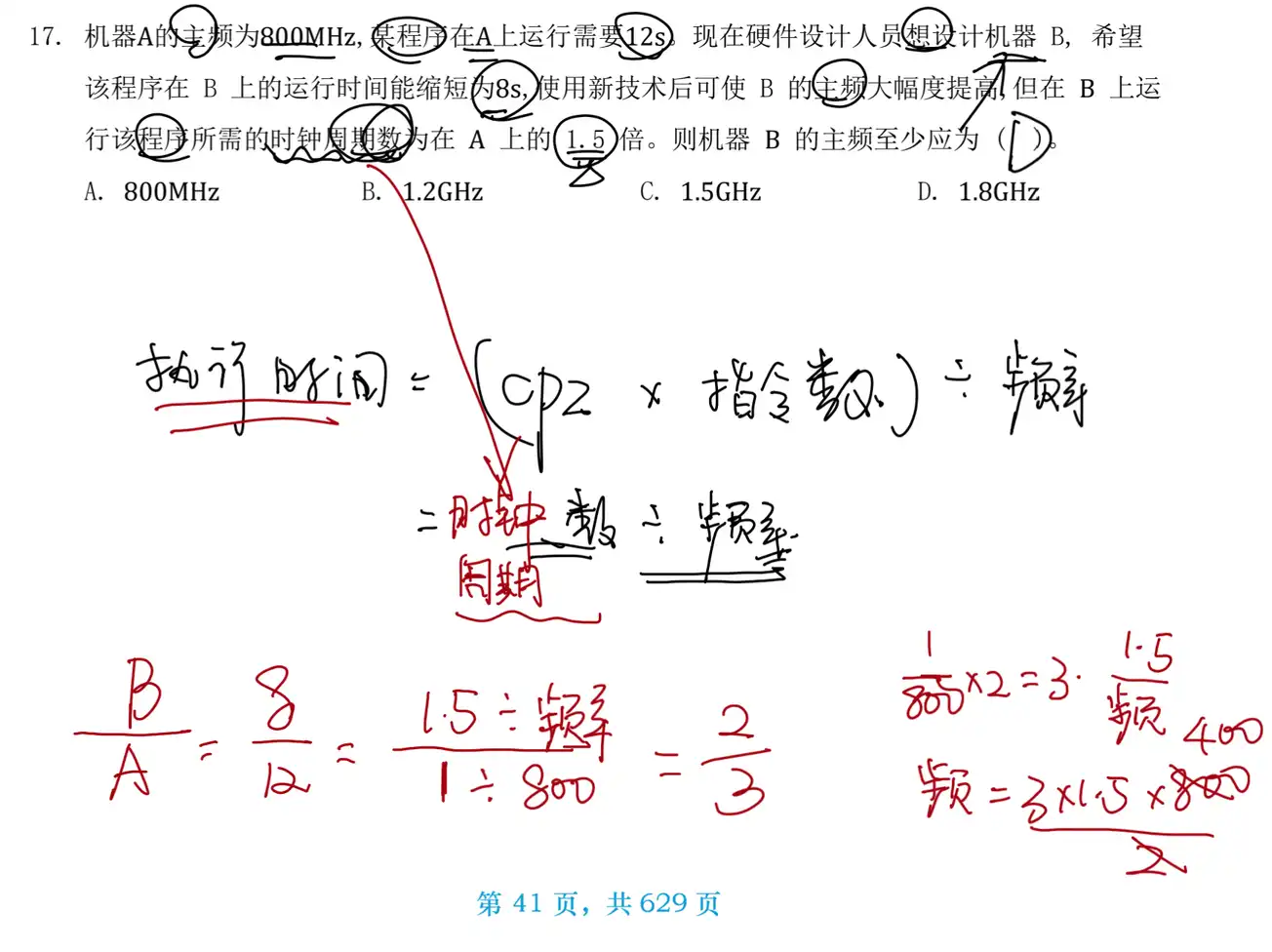 题17 题目 Q:机器 的主频为 ,某程序在 上运行需要 。现在硬件设计人员想设计机器 ,希望该程序在 上的运行时间能缩短为 ,使用新技术后可使 的主频大幅度提高,但在 上运行该程序所需的时钟周期数为在 上的 1.5 倍。则机器 的主频至少应为 ( ) 。 A. B. C. D. 分析 A:该程序在机器 上需要的时钟周期数为 ,因为在机器 上运行该程序所需的时钟周期数为在 上的 1.5 倍,所以在 上需要的时钟周期数为 ,要求运行时间为 ,故 的时钟频率为 。 解 选D