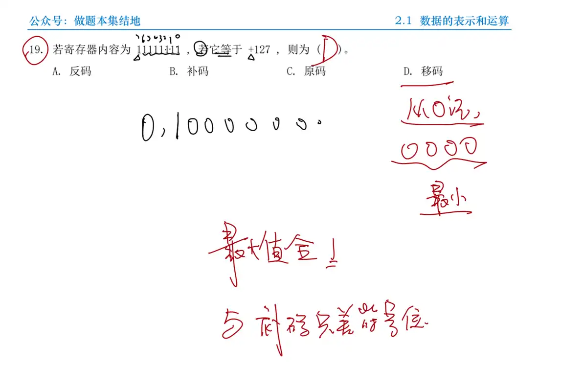 题19 题目 Q:若寄存器内容为 1111111 , 若它等于 +127 , 则为 ( )。 A. 反码 B. 补码 C. 原码 D. 移码 分析 A:注意看图,移码的大小(对应的真值)和二进制表示的值的大小是对应的,全1就是最大的移码 解 选D