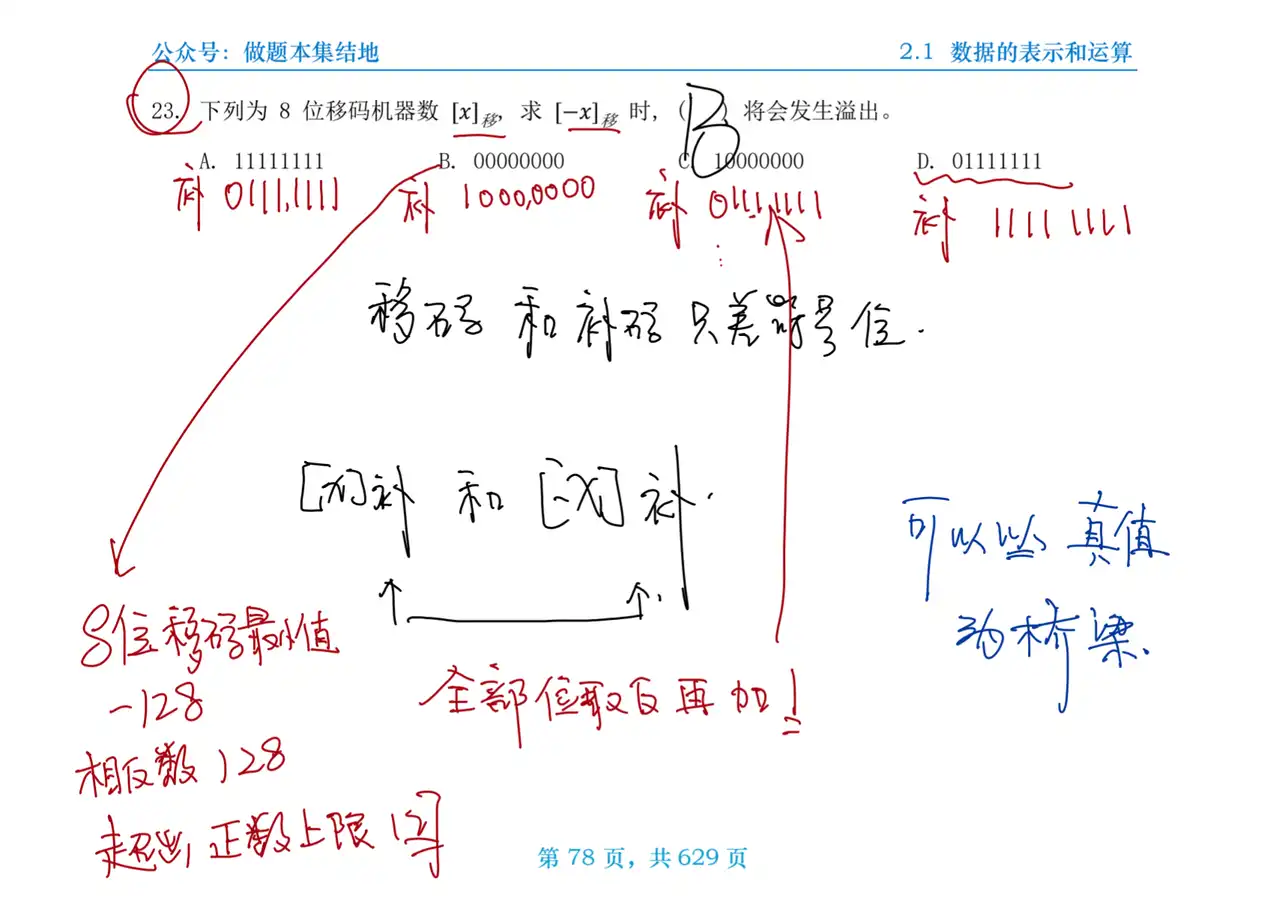 题23 题目 Q:下列为 8 位移码机器数 移 ,求 移 时,( ) 将会发生溢出。 A. 11111111 B. 00000000 C. 10000000 D. 011111111 分析 A:选项 对应 8 位最小的值 ,而 发生溢出,因此无法表示其移码。 解 选B