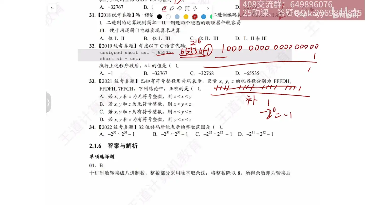 题32 题目 Q:【2019 统考真题】考虑以下 C 语言代码: unsigned short usi = 65535; short si = usi; 执行上述程序段后, si 的值是 ( )。 A. -1 B. -32767 C. -32768 D. -65535 分析 A:补码中重复的1理解为符号扩展,和题28还有题27是一个性质的 此外还要注意这个,65535的补码应该是怎么写的 2的16次,是1个1,接上16个0,因为有 是从0开始计的,所以有17个数字,而65535就是16个比特全1 解 选A