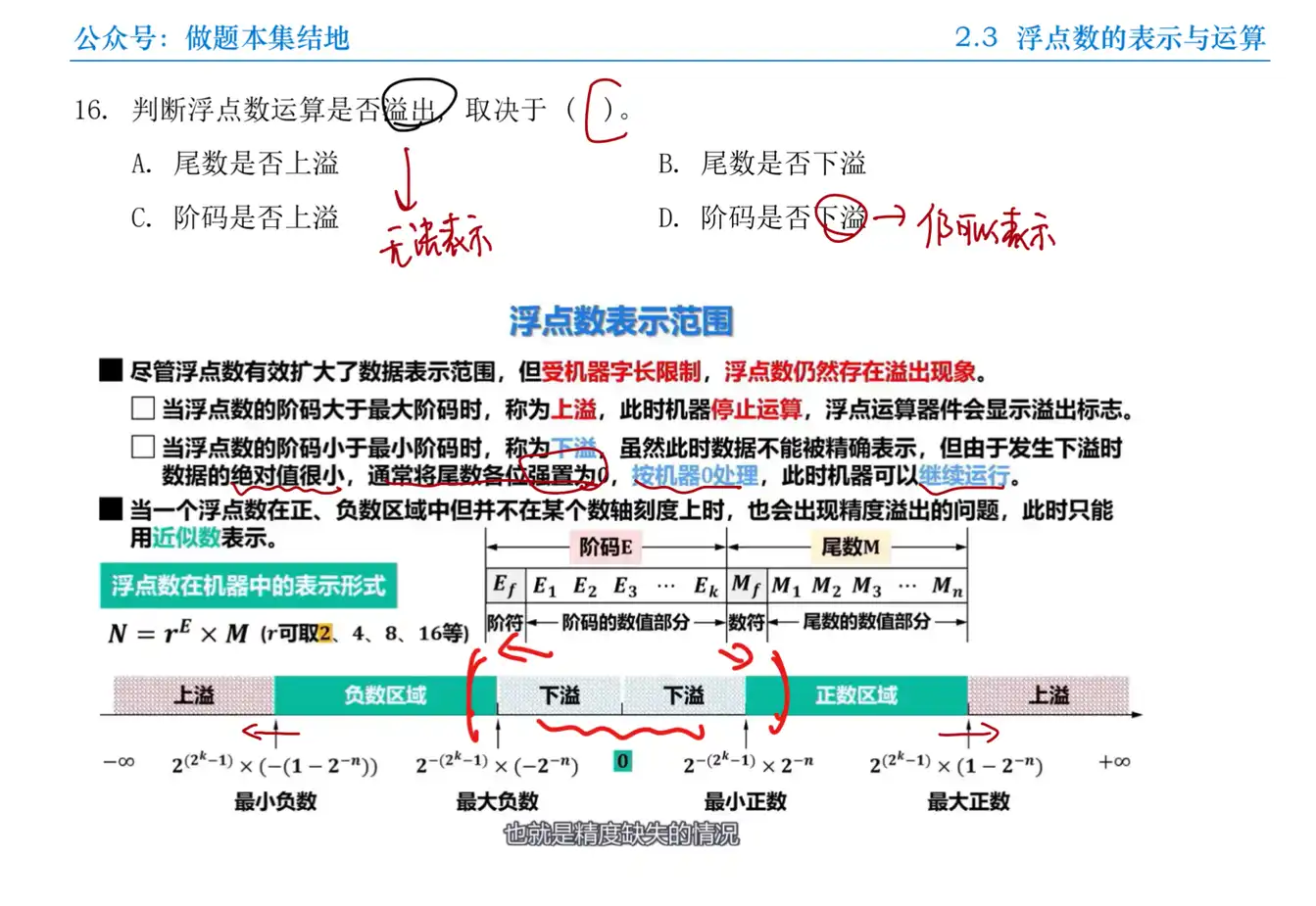 题16 题目 Q:判断浮点数运算是否溢出, 取决于 ( ) 。 A. 尾数是否上溢 B. 尾数是否下溢 C. 阶码是否上溢 D. 阶码是否下溢 分析 A:判断浮点数运算是否溢出, 取决于阶码是否上溢。 阶码下溢可以通过非规格化数来表示。尾数上溢或下溢, 可以通过左移或右移进行调整。 解 选C