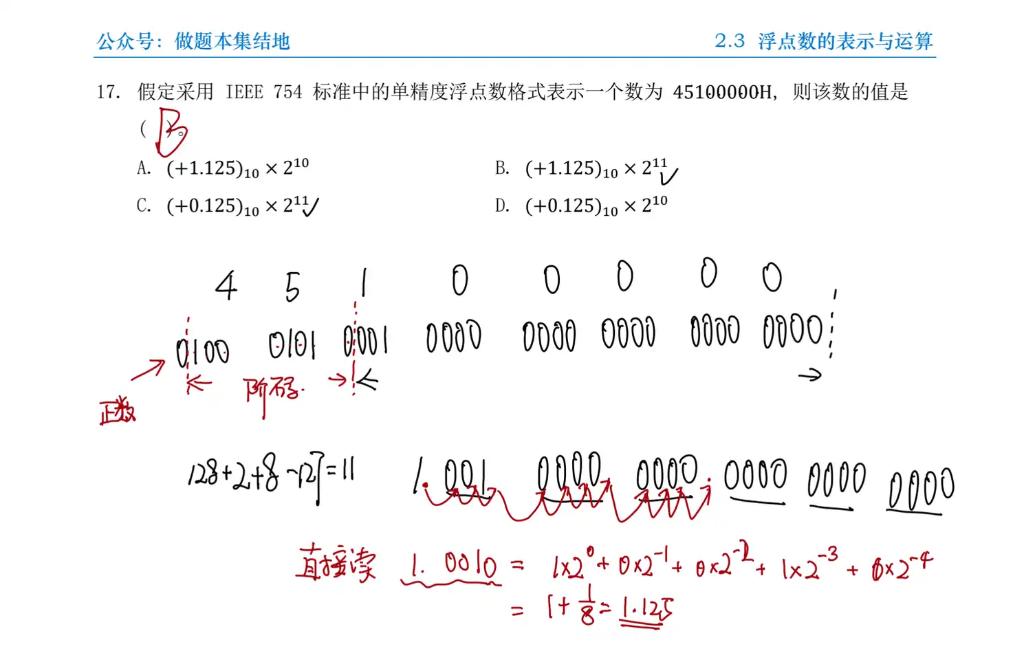 Q:假定采用 IEEE 754 标准中的单精度浮点数格式表示一个数为