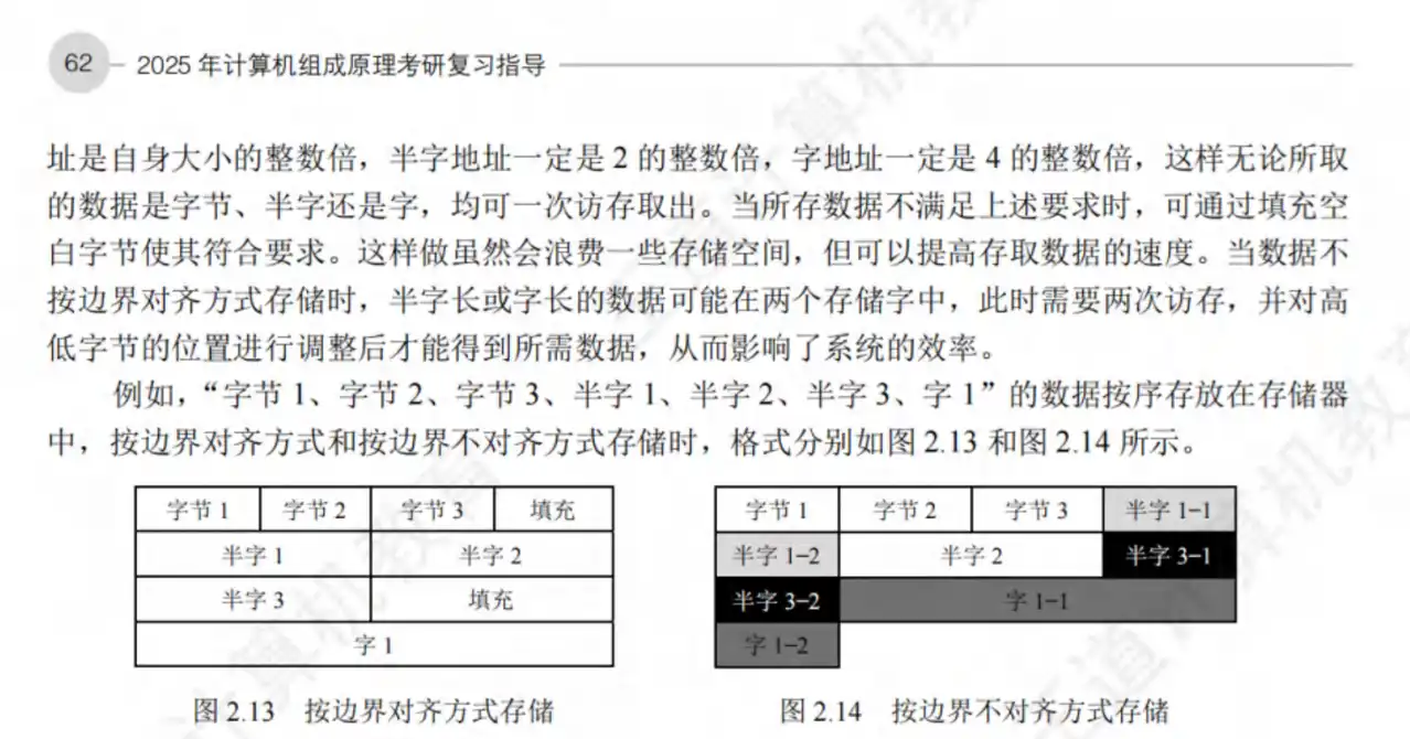 题26 题目 Q:计算机中的信息按边界对齐方式存储的含义是 ( ) 。 A. 信息的字节长度必须是整数 B. 信息单元的字节长度必须是整数 C. 信息单元的存储地址必须是整数 D. 信息单元的存储地址是其字节长度的整数倍 分析 A:信息在存储器中按边界对齐方式存储的含义是信息单元的存储地址是其字节长度的整数倍。 这样可以保证对一个字长数据的读/写只需要一次存储器访问, 提高了访存效率, 但有时会导致存储空间的浪费。 因此, 这是一种以空间换时间的办法。 解 选D