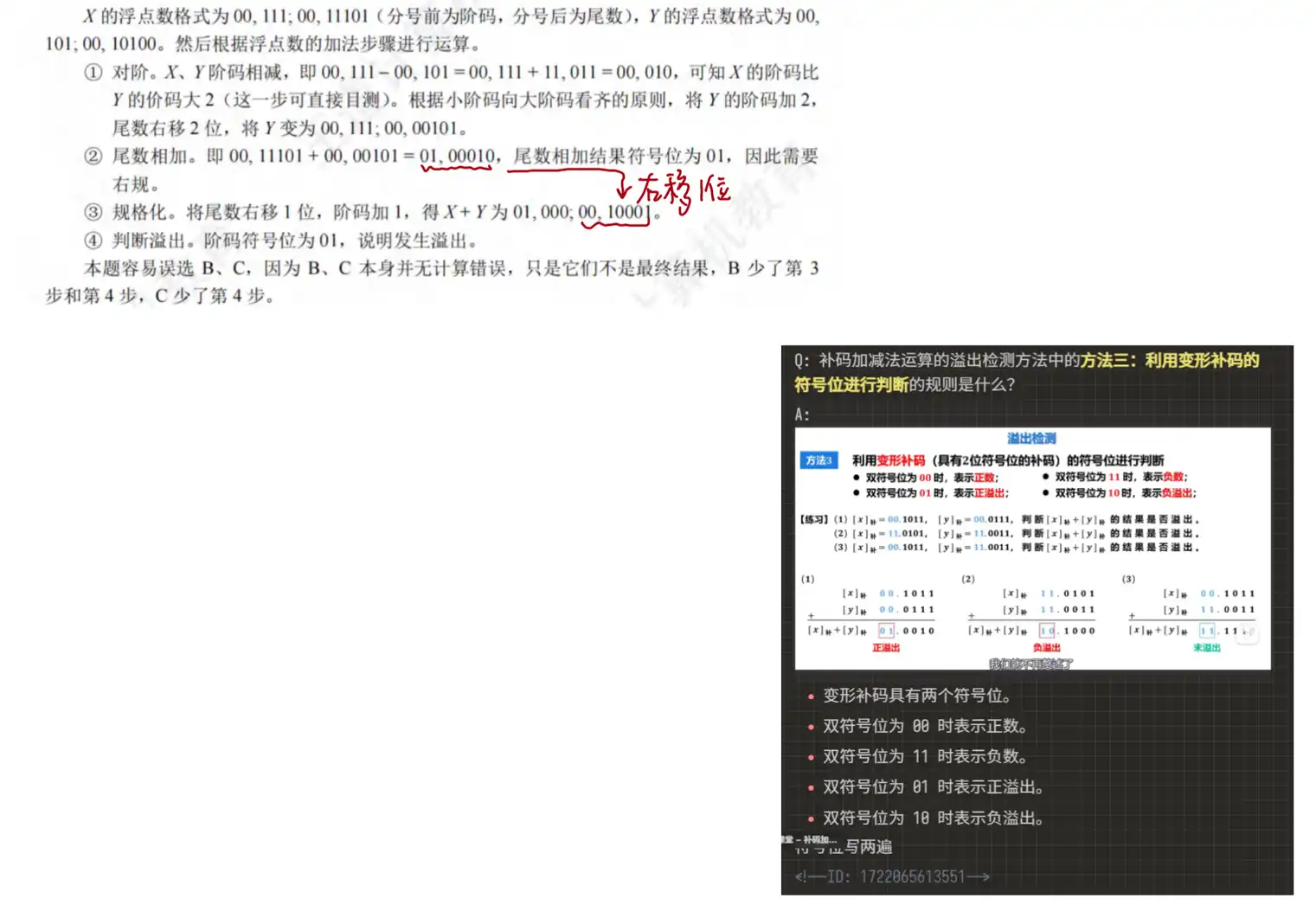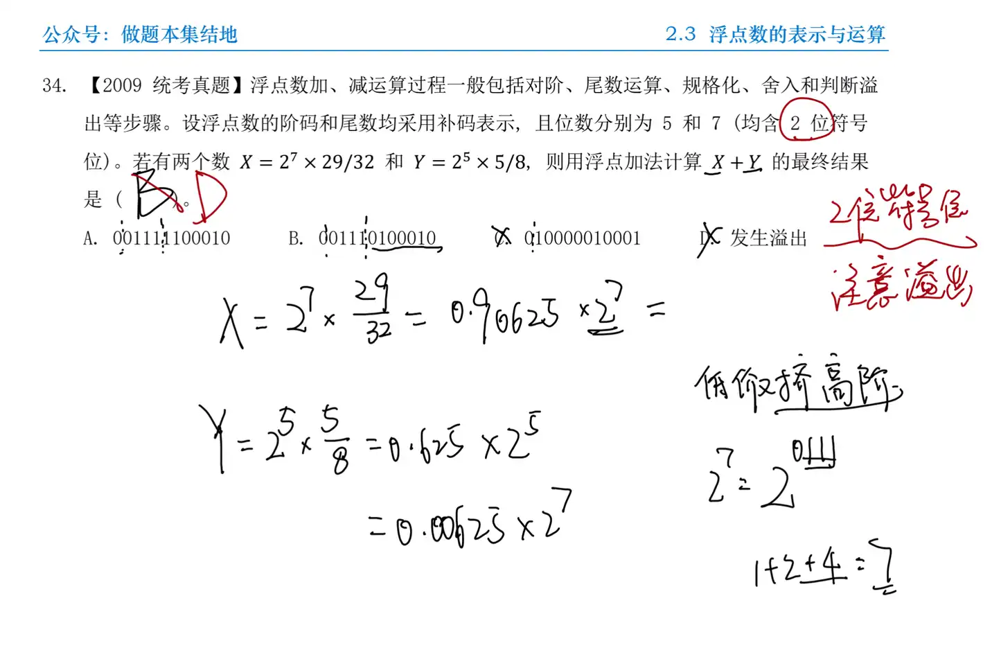 题34 题目 Q:【2009 统考真题】浮点数加、减运算过程一般包括对阶、尾数运算、规格化、舍入和判断溢出等步骤。设浮点数的阶码和尾数均采用补码表示,且位数分别为 5 和 7 (均含 2 位符号位)。若有两个数 和 ,则用浮点加法计算 的最终结果是 ( ) 。 A. 001111100010 B. 001110100010 C. 010000010001 D. 发生溢出 分析 A: 解 选D