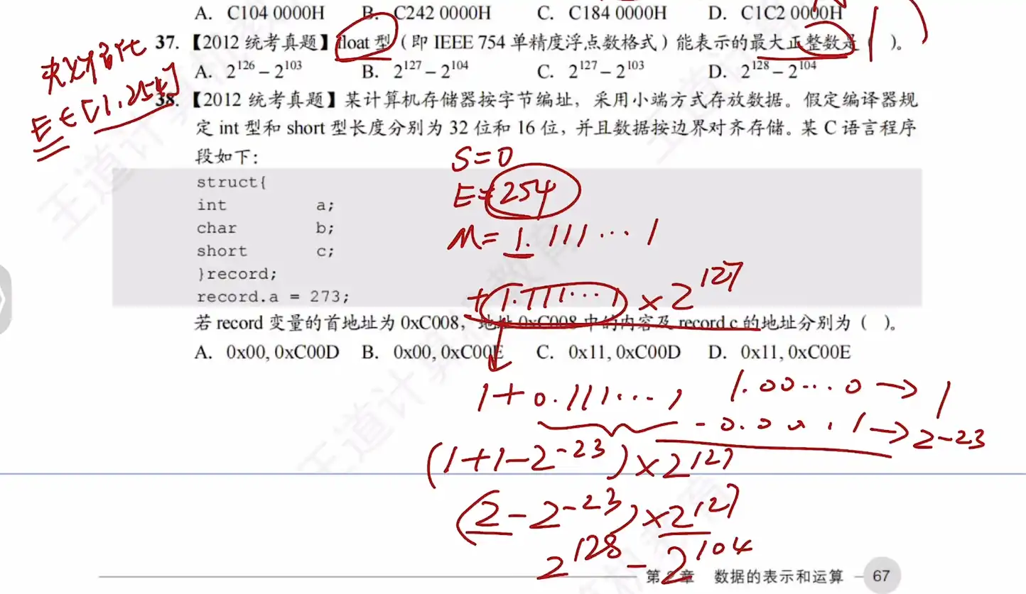 题37 题目 Q:【2012 统考真题】float 型 (即 IEEE754 单精度浮点数格式) 能表示的最大正整数是 ( ) A. B. C. D. 分析 A:注意尾数这里的 是怎么转化的为十进制真值的 解 选D
