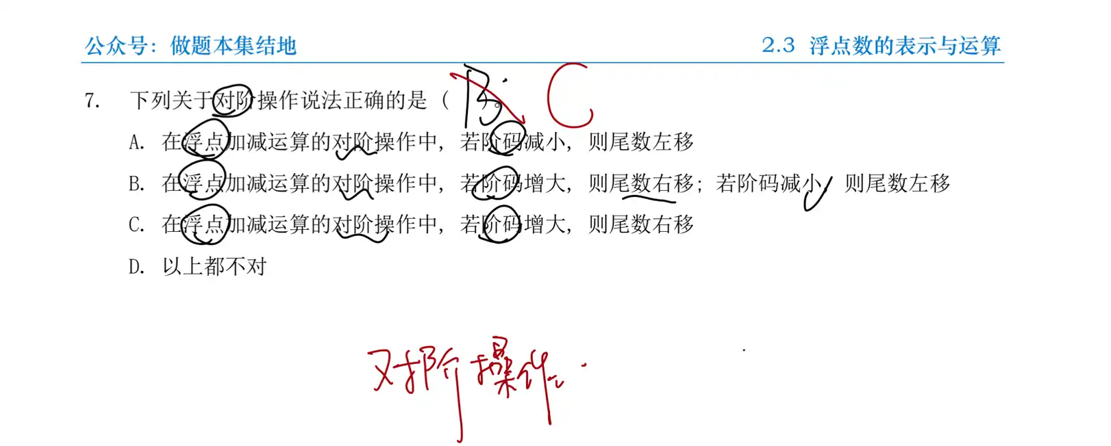题7 题目 Q:下列关于对阶操作说法正确的是 ( ) 。 A. 在浮点加减运算的对阶操作中, 若阶码减小, 则尾数左移 B. 在浮点加减运算的对阶操作中, 若阶码增大, 则尾数右移; 若阶码减小, 则尾数左移 C. 在浮点加减运算的对阶操作中, 若阶码增大, 则尾数右移 D. 以上都不对 分析 A:对阶操作, 是将较小的阶码调整到与较大的阶码一致, 因此不存在阶码减小、尾数左移的情况, 因而 A、B 错误。 对阶只会把小阶码对齐到大阶码 解 选C