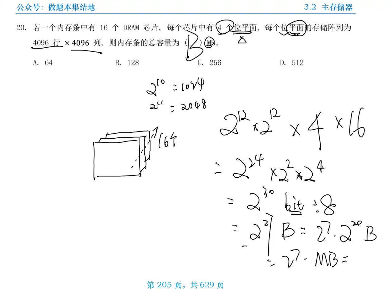 题20 题目 Q:若一个内存条中有 16 个 DRAM 芯片, 每个芯片中有 4 个位平面, 每个位平面的存储阵列为 4096 行 列,则内存条的总容量为 ( ) MB。 A. 64 B. 128 C. 256 D. 512 分析 A:DRAM 芯片的容量 位平面数 行数 列数,即由位平面数、存储阵列的行数和列数决定。 故一个 DRAM 芯片的容量为 ,故内存条的总容量为 解 B
