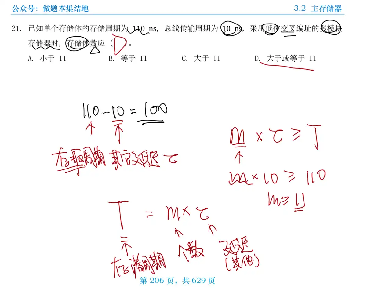 A:低位交叉编址多模块存储器, 采用轮流启动的方式时, 类似于流水线的工作方式, 为保证某个模块再次启动时, 其上次的存取操作已完成 (流水线不间断), 要求两次启动间隔的时间必须大于或等于一个存储周期,即 “模块数