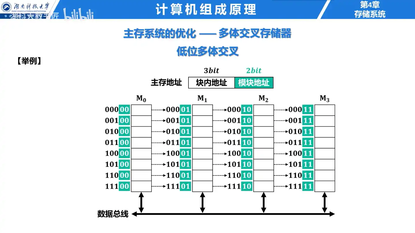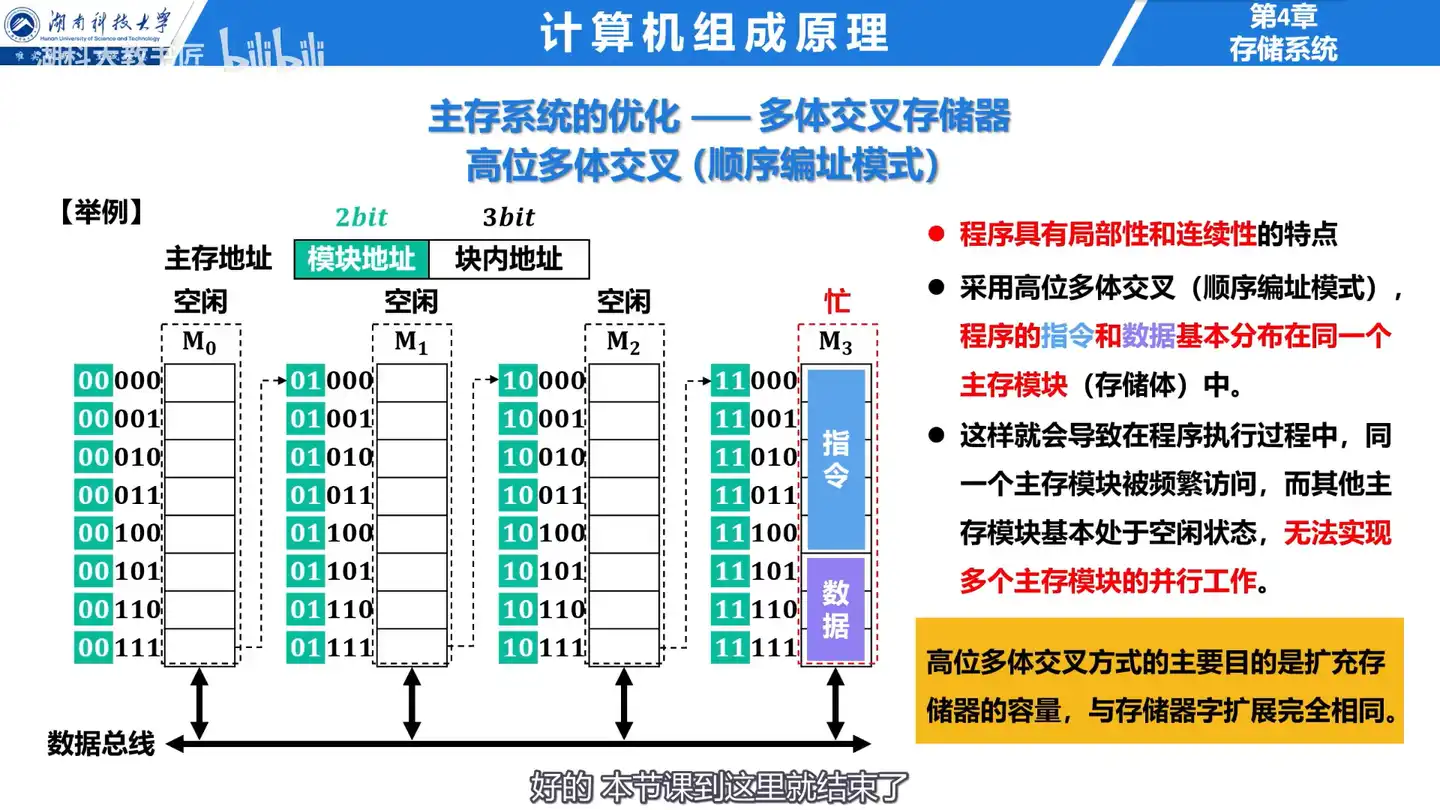 题26 题目 Q:多模块存储器之所以能提高存储器的访问速度, 是因为 ( )。 A. 采用了高速元器件 B. 各模块有独立的读/写电路 C. 采用了信息预读技术 D. 模块内各单元地址连续 分析 A:多模块存储器各模块有独立的读/写电路, 可以实现并行操作, 故多模块存储器能进行高速的读/写操作。 采用低位交叉编址的多模块存储器各单元地址不连续。 注意看,顺序和交叉两个多模块组合的存储器中,哪一个模块内的地址顺序是顺的 解 选B