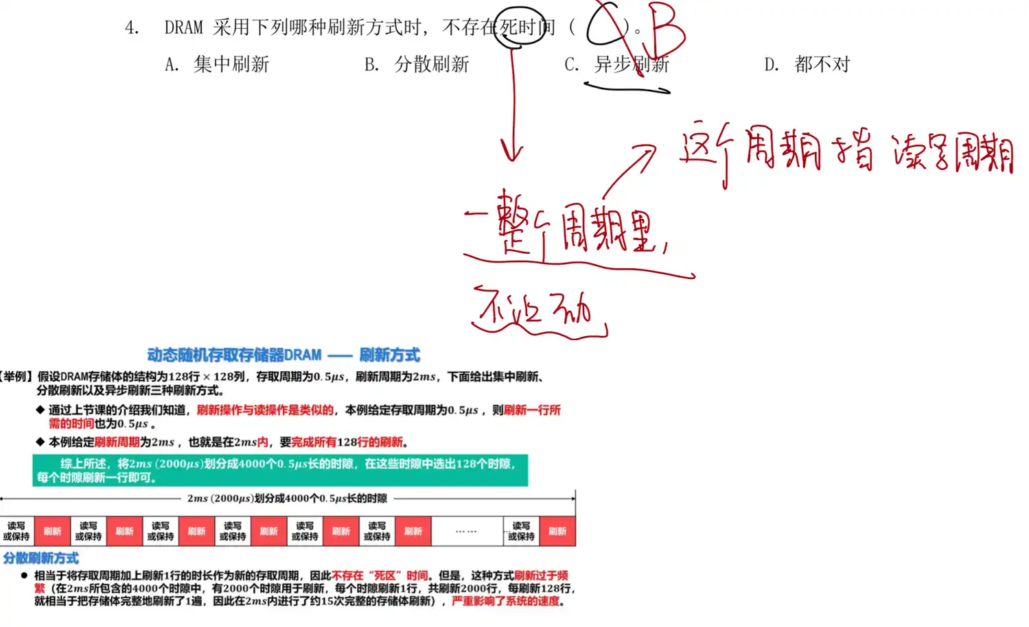 题4 题目 Q:DRAM 采用下列哪种刷新方式时, 不存在死时间 ( )。 A. 集中刷新 B. 分散刷新 C. 异步刷新 D. 都不对 分析 A:集中刷新必然存在死时间。 采用分散刷新时, 机器的存取周期中的一段用来读/写, 另一段用来刷新, 因此不存在死时间, 但存取周期变长。 异步刷新虽然缩短了死时间, 但死时间依然存在。 解 B