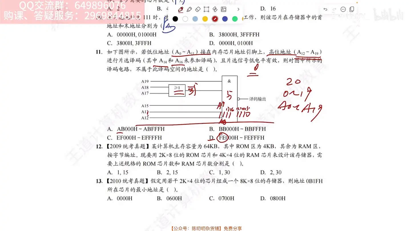 题11 题目 如下图所示,若低位地址 接在内存芯片地址引脚上,高位地址 进行片选译码 (其中 和 未参加译码),且片选信号低电平有效,则对图中所示的译码电路, 不属于此译码空间的地址是 ( )。 A. B. C. EFOOOH EFFFFH D. FE000H FEFFFH 分析 17:42 解 B