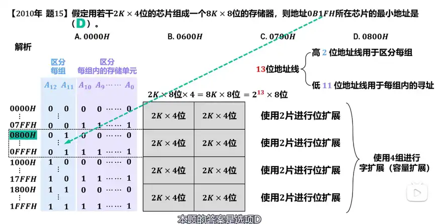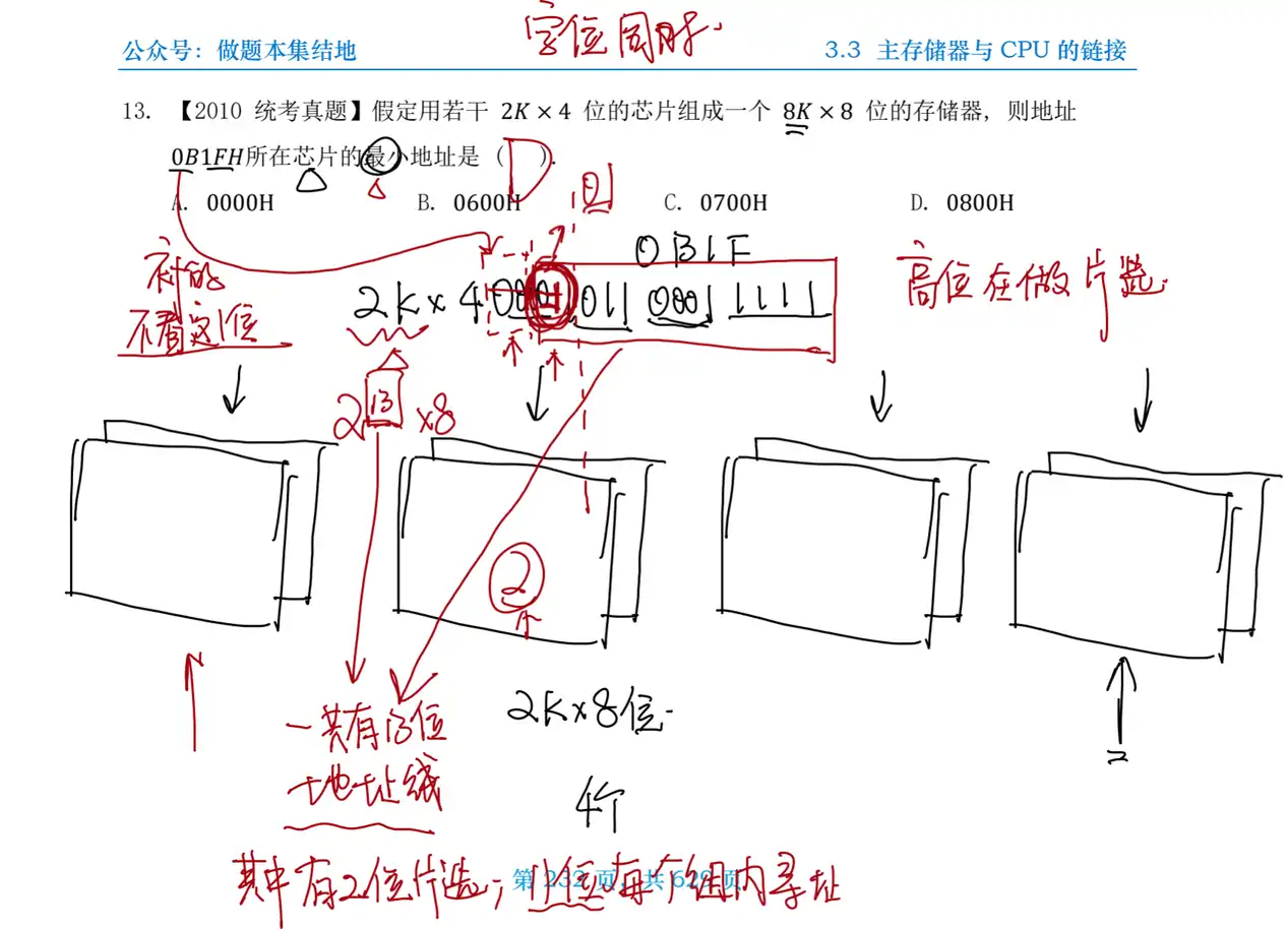 题13 题目 Q:【2010 统考真题】假定用若干个 2K×4 位的芯片组成一个 8K×8 位的存储器,则地址 0B1FH 所在芯片的最小地址是( )。 A. 0000H B. 0600H C. 0700H D. 0800H 分析 A:总容量下的地址线的个数,决定了这个寻址的起始空间 这里在容量上做了字扩展,而字扩展就是高位顺序交叉,也就是高两位来做片选,如果要是低下来的两位,他会说是低位交叉或者说,做了交叉编址 而无论高位还是低位都是在做字扩展 解 D